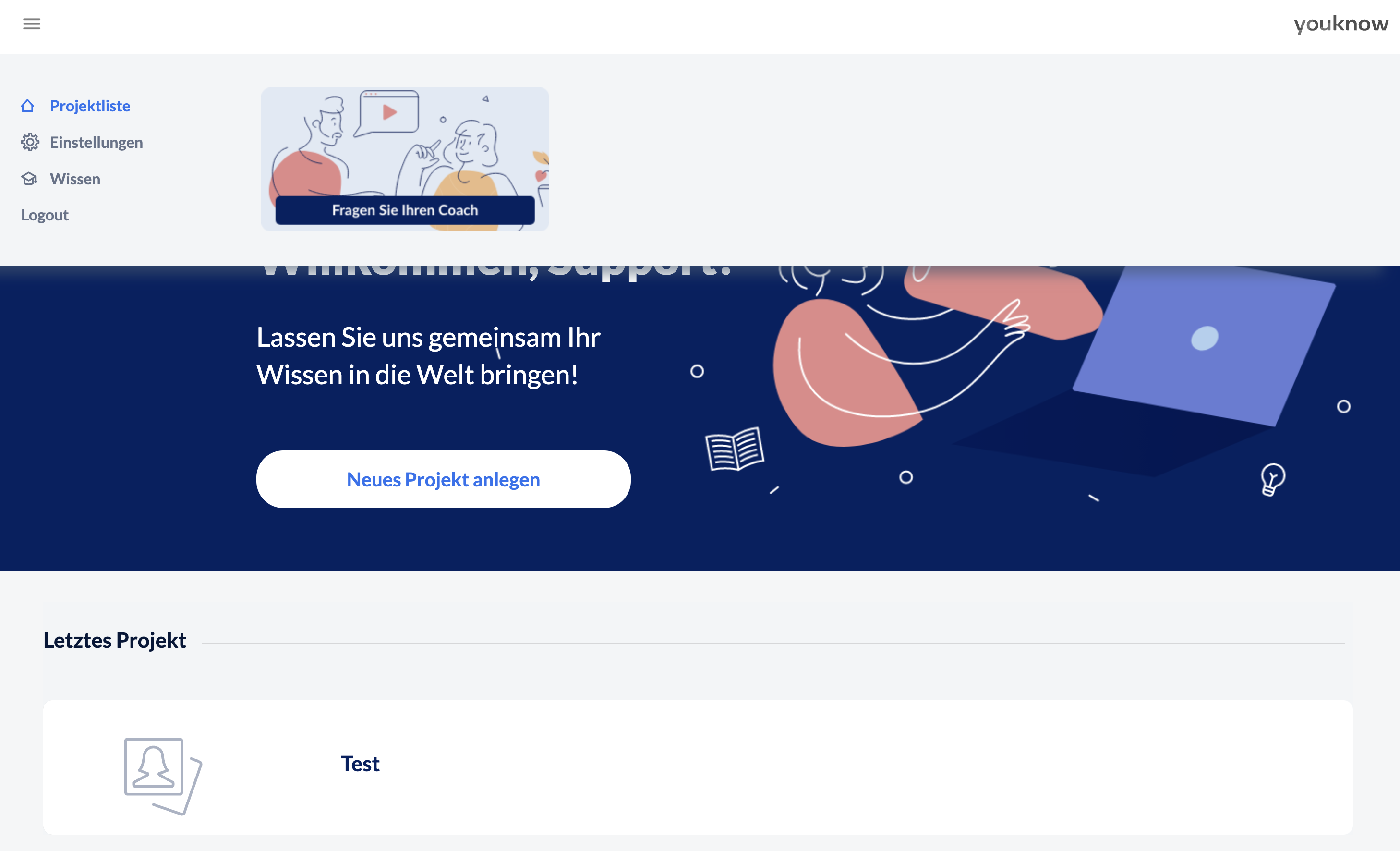 Nach der Anmeldung bei knowtion gelangen Sie zur Startseite. Hier können Sie über das Burger-Menü oben links z. B. den Wissenspool von knowtion und Ihre persönlichen Einstellungen aufrufen. Zudem erhalten Sie auf der Startseite einen Überblick über alle von Ihnen anlegten Projekte.
