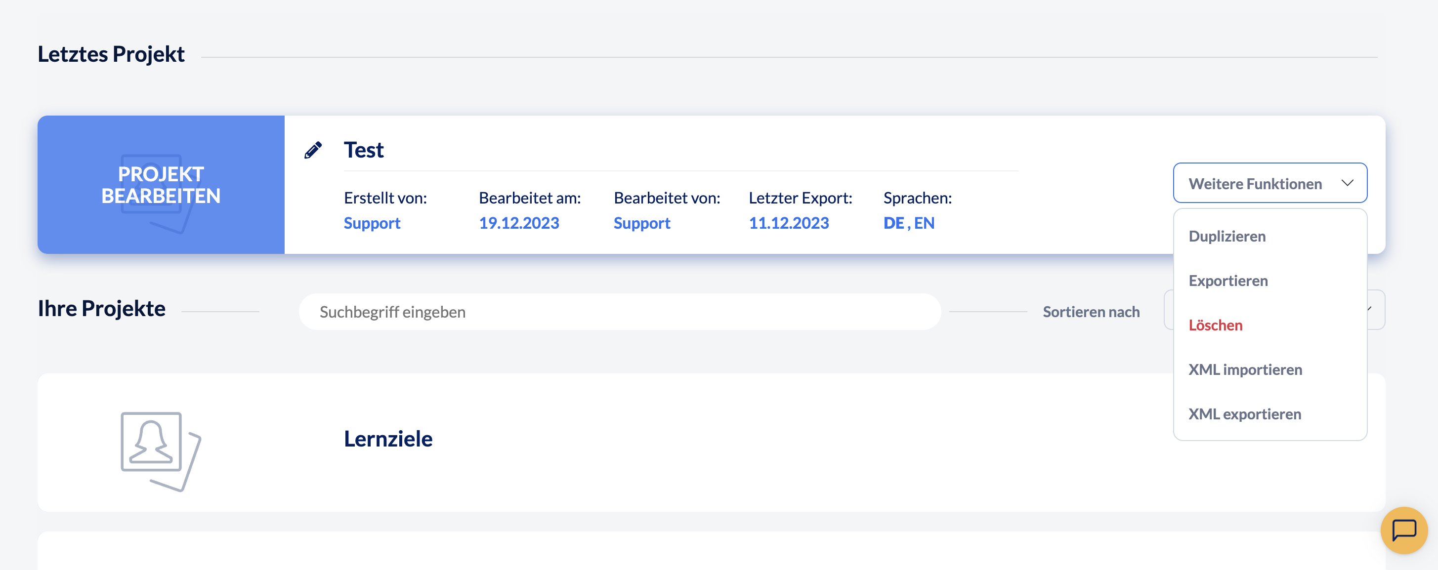 Sie können Ihre Projekte nach verschiedenen Kriterien sortieren und sie im Bereich „Weitere Funktionen“ duplizieren, exportieren oder löschen. Und natürlich können Sie auch direkt das zuletzt bearbeitete Projekt fortsetzen oder ein neues Projekt anlegen.
