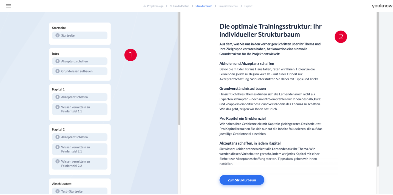 Auf der Basis Ihrer Eingaben in der Projektanlage und dem Guided Setup entwickelt knowtion eine didaktisch sinnvolle Gliederung, den sogenannten Strukturbaum. Der Strukturbaum wird Ihnen auf einer Übersichtsseite vorgestellt (1)) und die zugrundeliegenden didaktischen Prämissen erklärt (2).