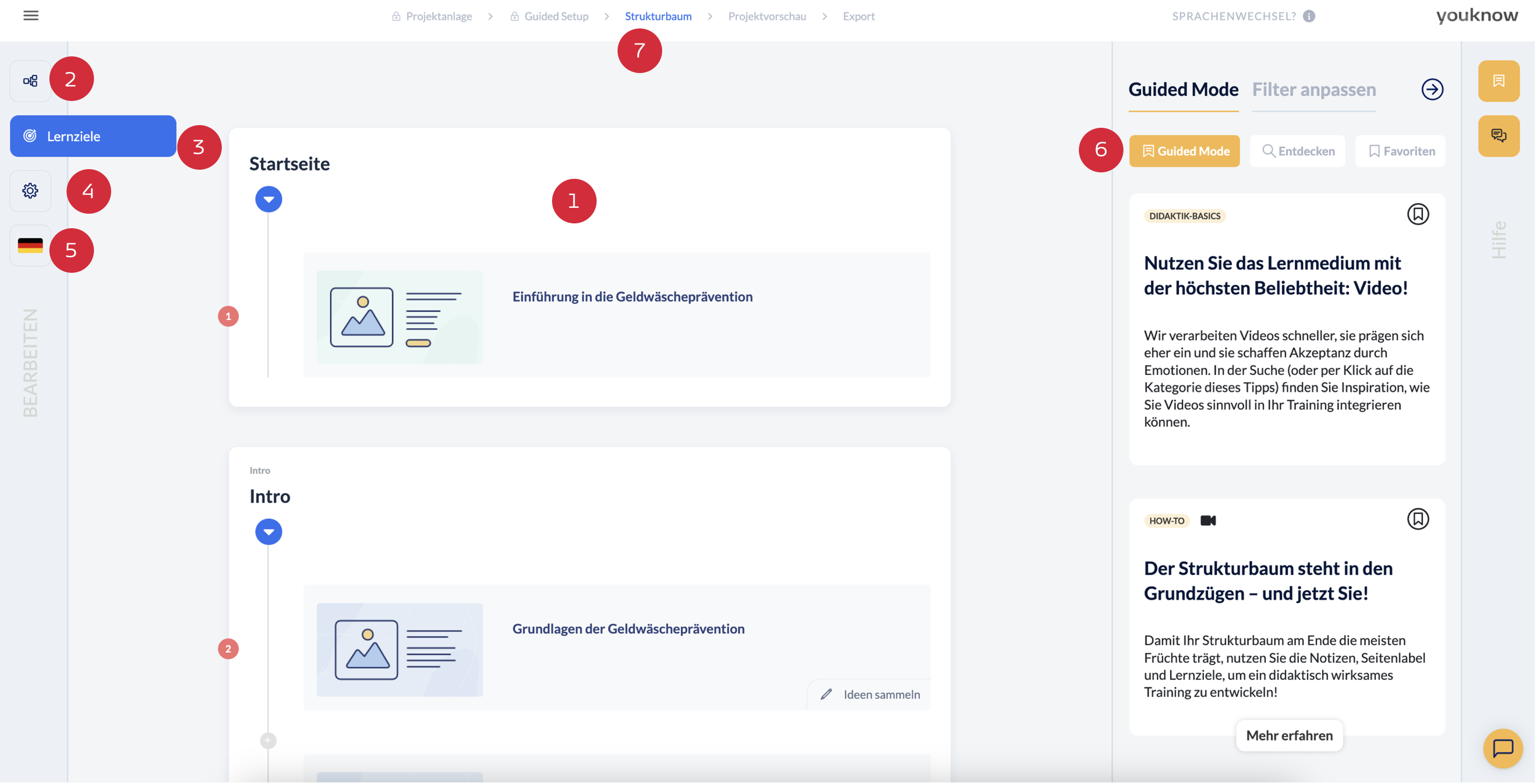 Die rechte Bildschirmleiste bietet Ihnen Unterstützung bei der Bearbeitung Ihres Projekts: Dort finden Sie den Guided Mode (6), der Sie mit passgenauen Tipps unterstützt. Oben am Bildschirm in der Prozessleiste (7) gelangen Sie zur Projektvorschau und zum Exportbereich.