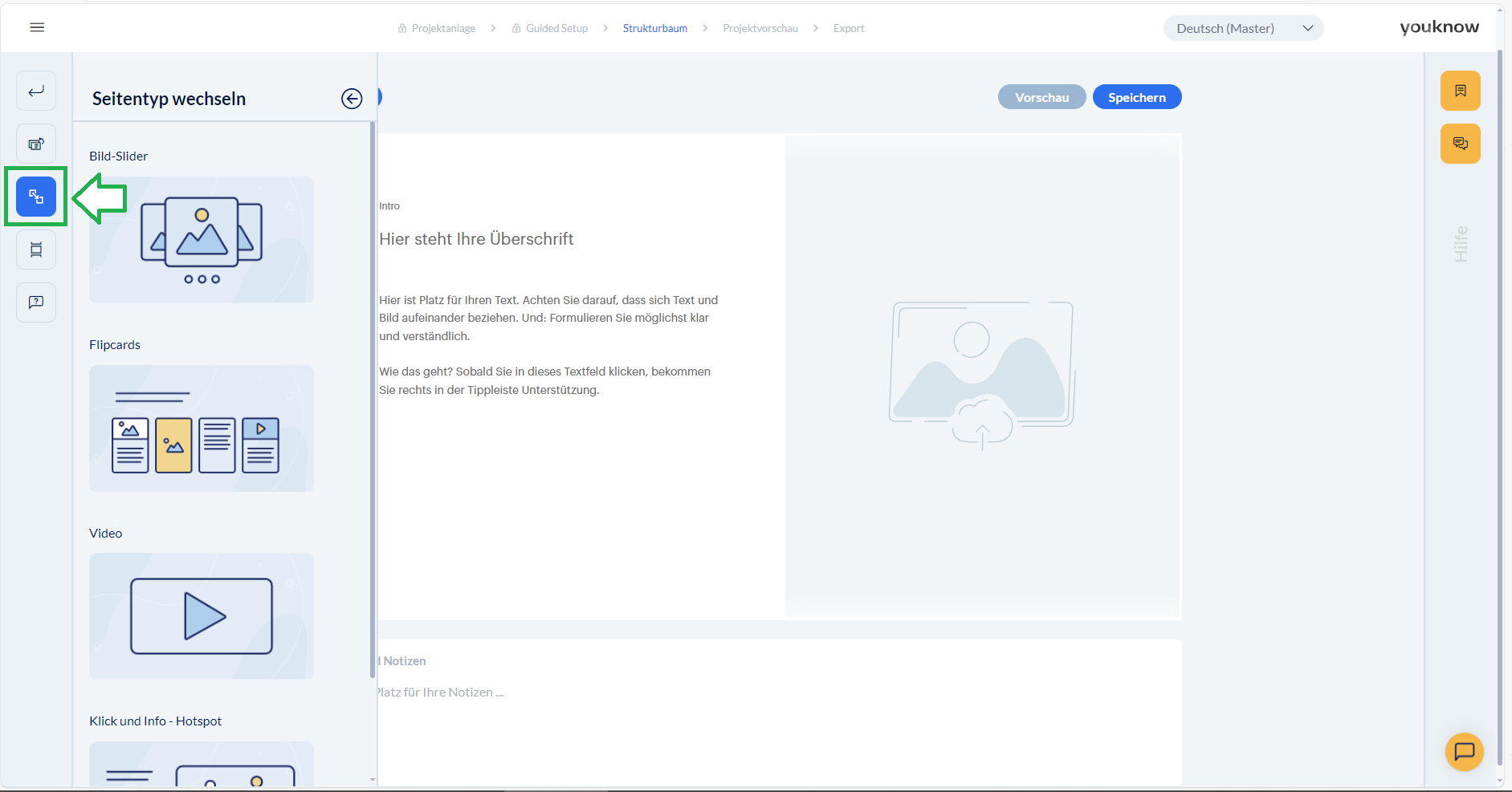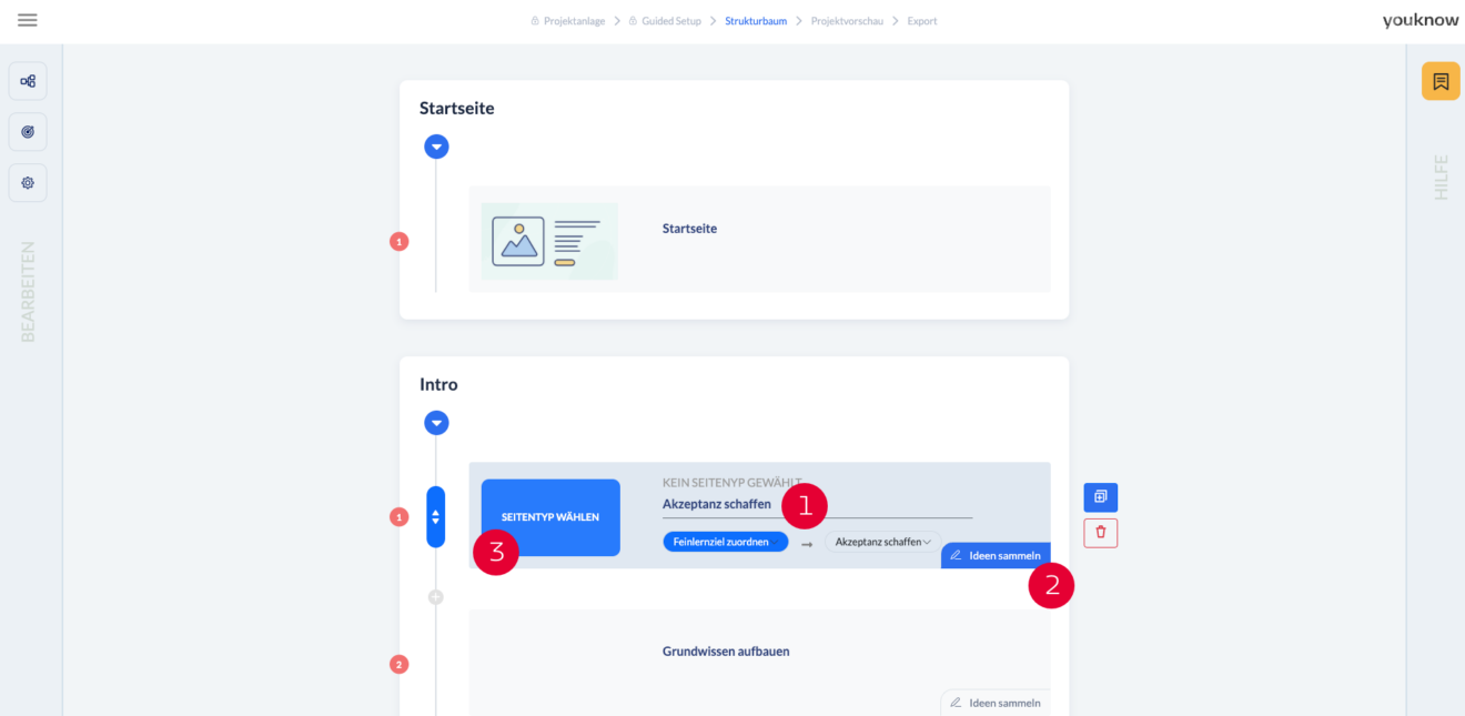Seitentyp wählen (3) – über den Klick auf “Seitentyp wählen” können Sie festlegen, ob Ihre Seite eine Flipcard-, Hot Spot-, Video-, Multiple Choice- Seite etc. wird.