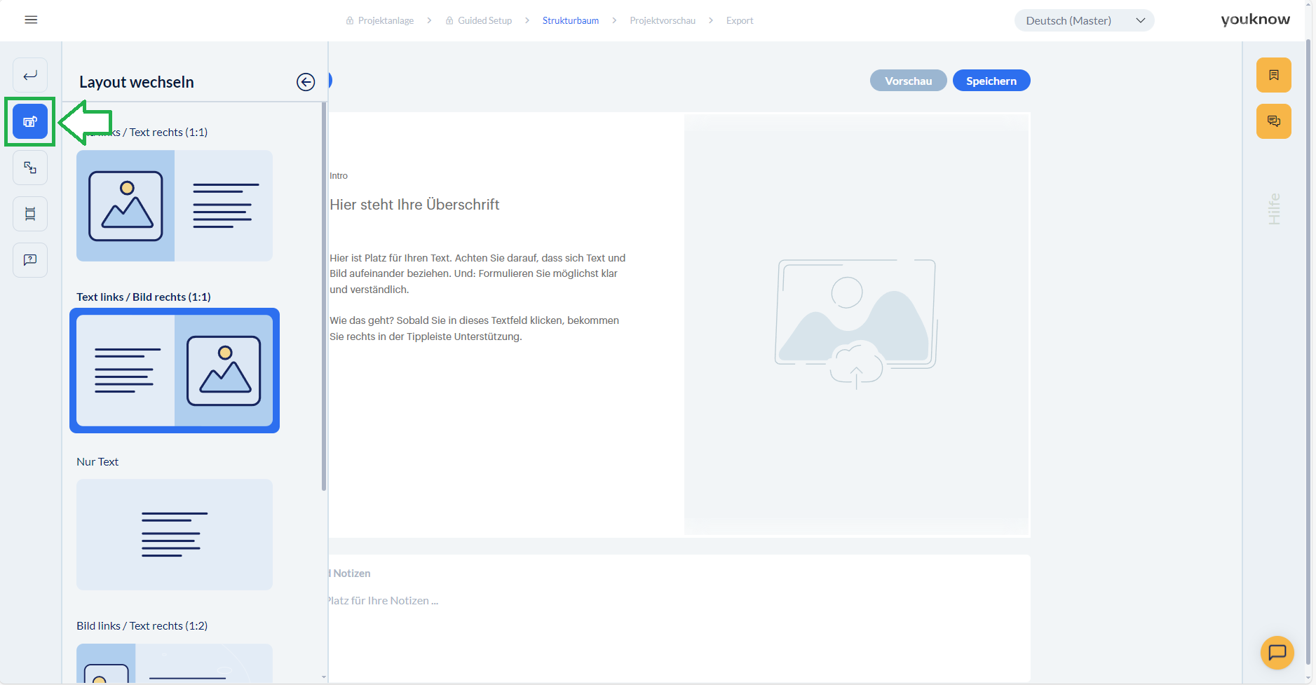 Wenn Sie gerade eine einzelne Seite bearbeiten, können Sie im Seiteneditor links über den Button „Layout wechseln“ das Layout der Seite beeinflussen. Bei einer Text/Bild-Seite können Sie sich zum Beispiel überlegen, ob Sie ausschließlich den Text anzeigen lassen möchten, oder aber ob Sie Text und Bild nutzen möchten. Hierbei können Sie neben der Positionierung der Elemente auch zwischen verschiedenen Größenverhältnissen wählen.