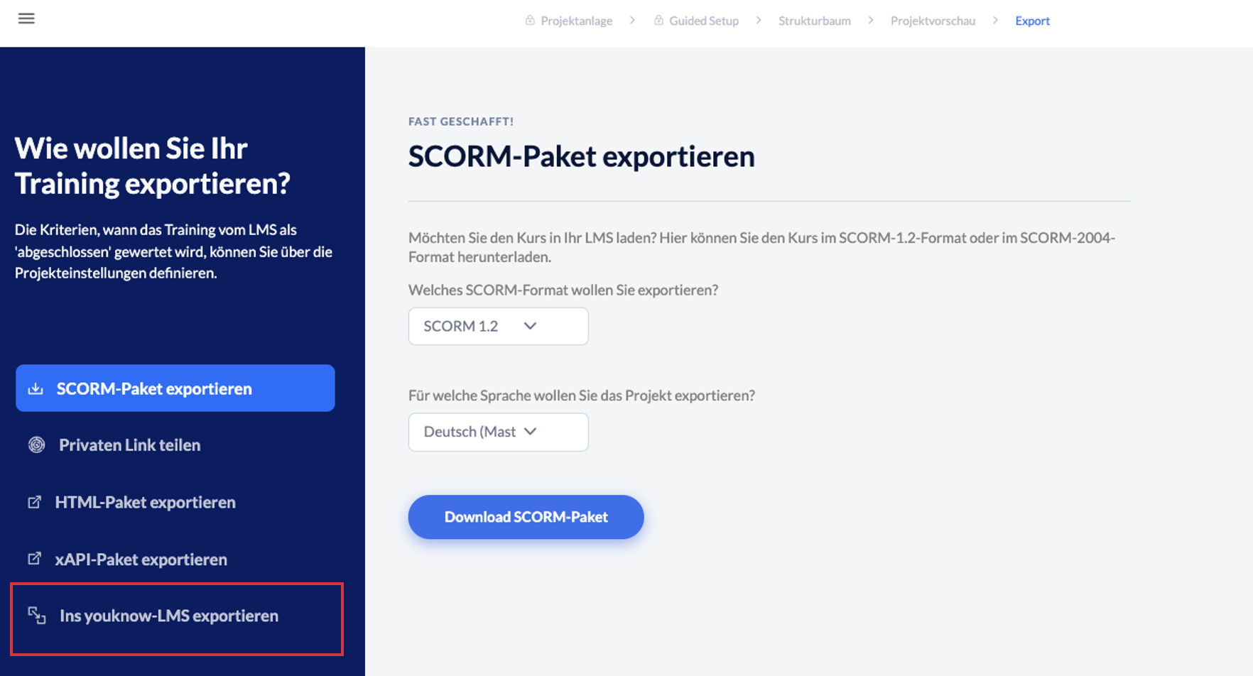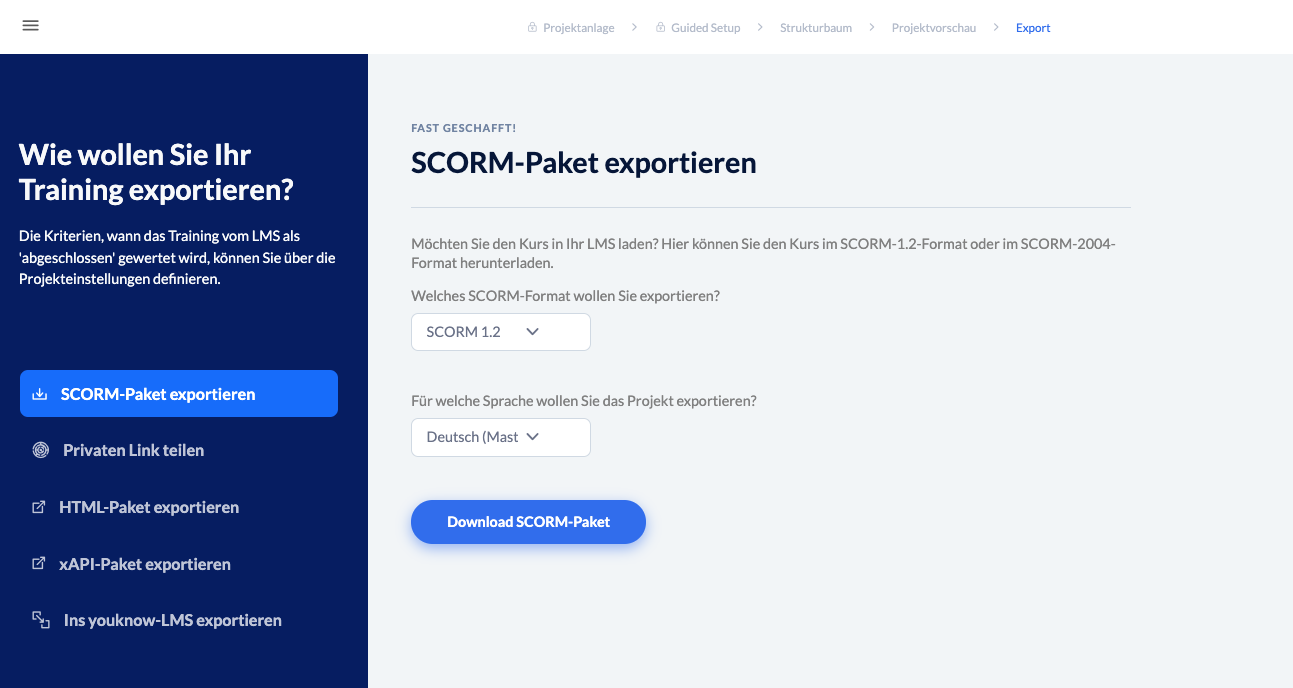 Sollten Sie ein LMS von youknow haben, gibt es die Möglichkeit das Training über den Button ganz unten direkt in Ihr LMS zu exportieren.