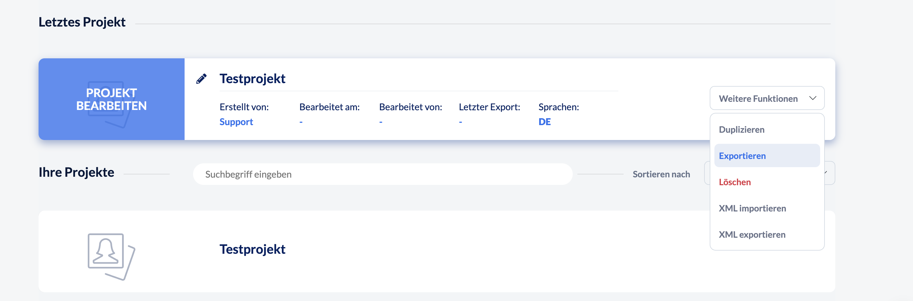 Gut zu wissen: Anstatt über den Strukturbaum zu gehen, können Sie alternativ auch in der Projektliste über "Weitere Funktionen" und "Exportieren" zur Exportseite gelangen.