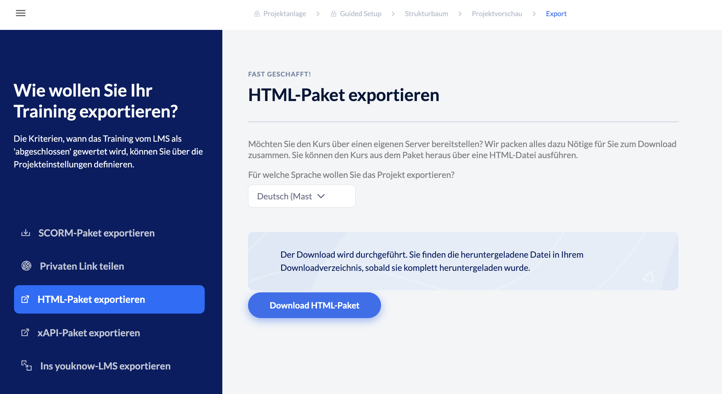 Sie haben kein LMS? Dann können Sie Ihre digitalen Lerninhalte zum Beispiel auch einfach als HTML-Paket herunterladen und auf Ihren Server laden.
