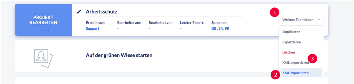 Für die Zusammenarbeit mit Übersetzungsbüros gibt es die Möglichkeit mit xml Dateien zu arbeiten. Dafür können Sie in der Projektliste über "Weitere Funktionen"(1) die Datei exportieren (2), sowie die überarbeitete Datei auch importieren (3).