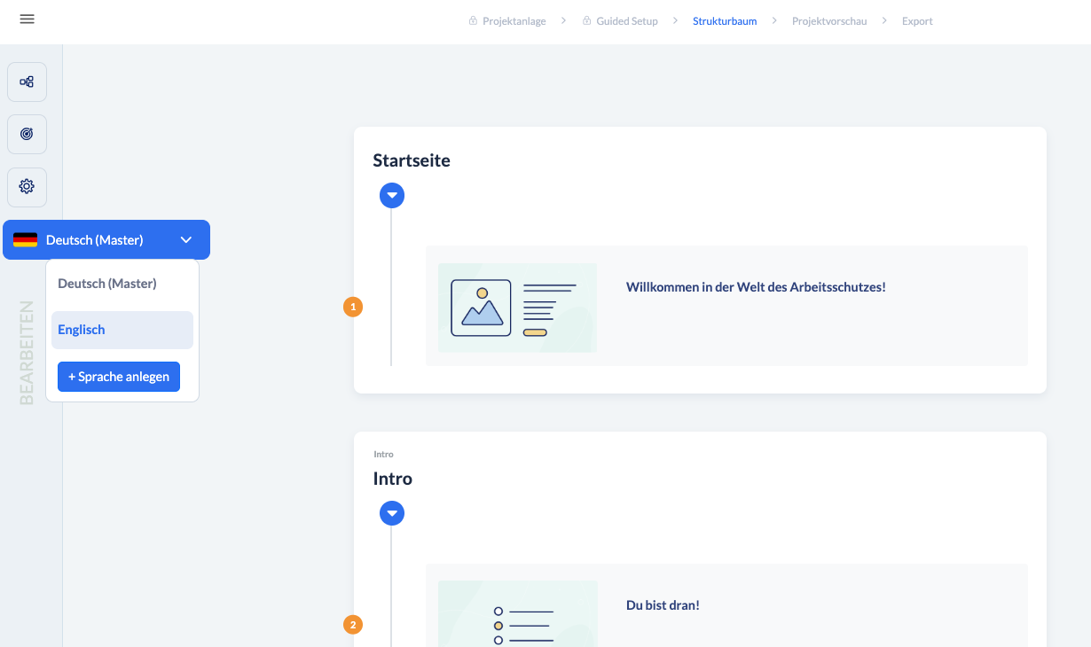 Anschließend ist auch im Projekt eine Sprachfassung für die importierte Sprache angelegt. Diese kann im Strukturbaum über die kleine Flagge in der Seitenleiste aufgerufen werden. Einfach auf die Flagge klicken und dann im Dropdown Menü die entsprechende Sprachversion auswählen.