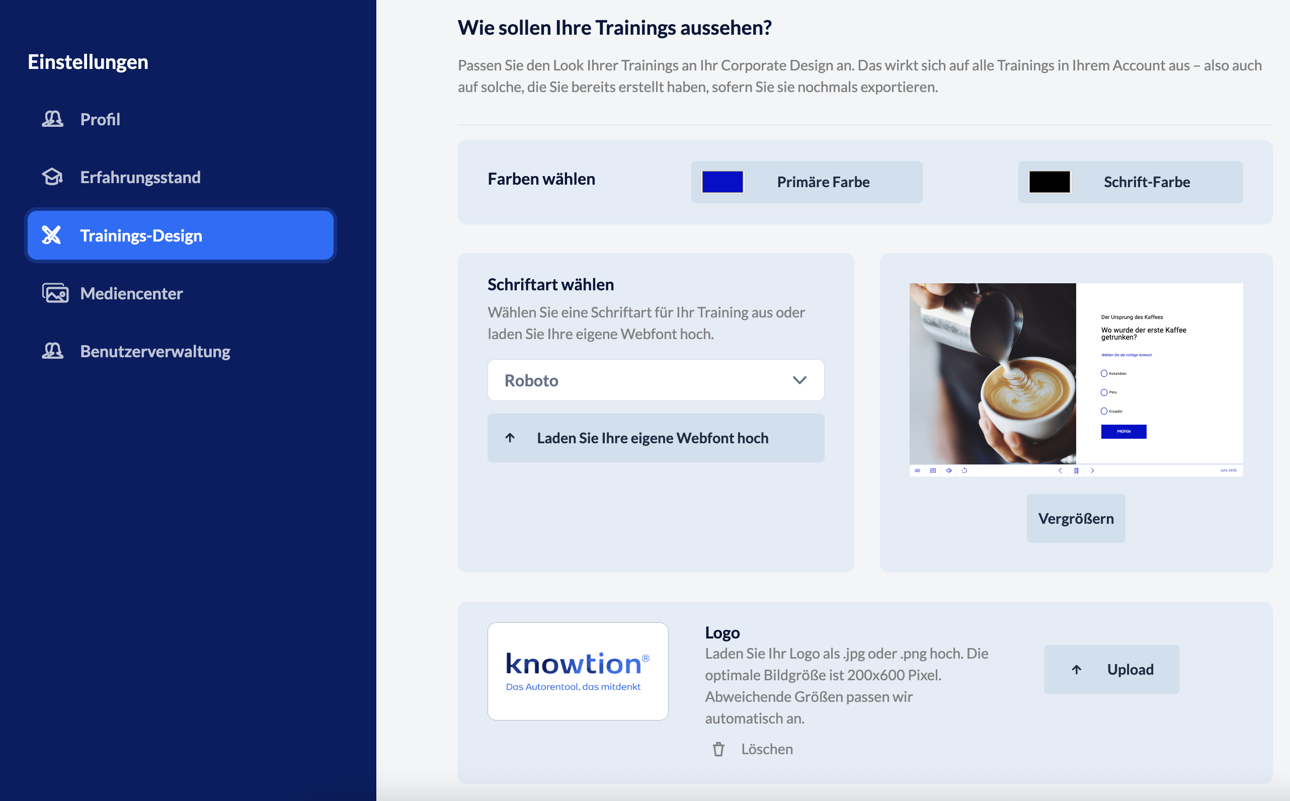 Bitte beachten Sie, dass sich Anpassungen im Trainings-Designer auf alle Ihre in knowtion angelegten Projekte auswirken. Ändern Sie beispielsweise die Schriftart, dann erscheinen die Texte in allen von Ihnen erstellten Projekten in der neuen Schriftart. Das gilt nicht für bereits exportierte Projekte. Hier bleiben die Designelemente unverändert.