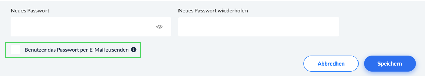 E-Mail: Das ist ein Pflichtfeld. Es ermöglicht es Ihnen, den User-Zugang direkt an den neuen User zu schicken, indem Sie das kleine Kästchen links unten im Popup anhaken.