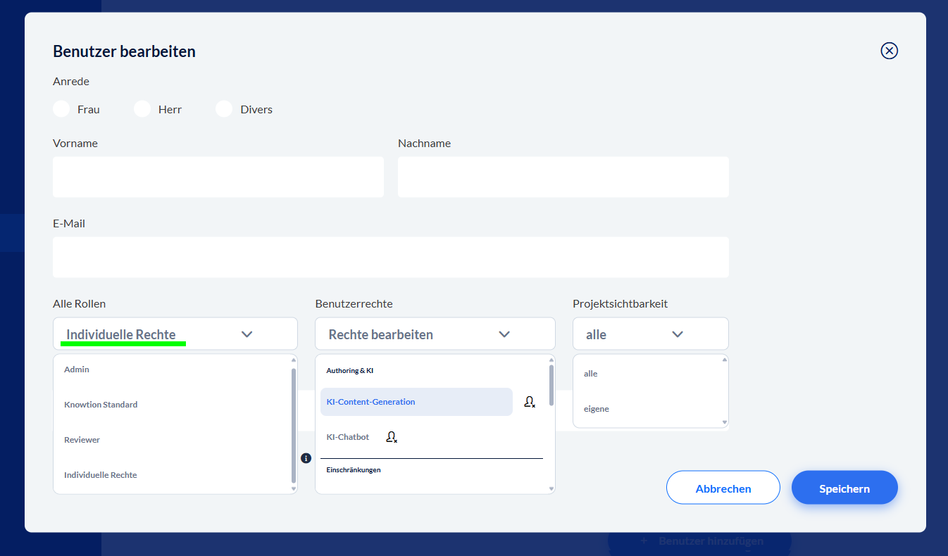 Benutzerrechte: Dieses Dropdown-Menü ist nur bearbeitbar, wenn Sie bei der Rolle “Individuelle Rechte” ausgewählt haben. Dann können Sie hier die gewünschten Rechte für die Rolle individuell zusammenstellen.