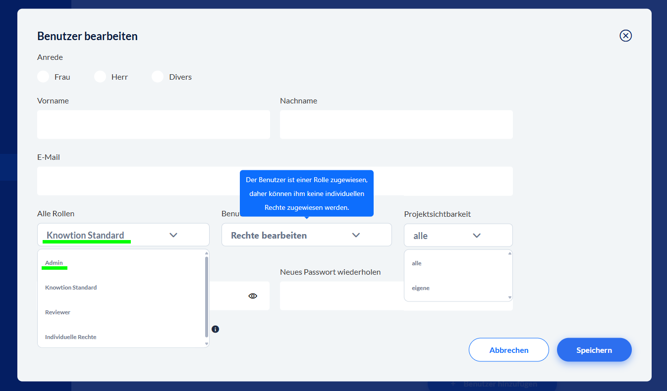 Hier sehen Sie, dass die Auswahl der Rolle “Knowtion Standard” bedeutet, dass Sie keine individuellen Rechte zuordnen können. Diese Rolle hat bereits bestimmte Rechte festgelegt: