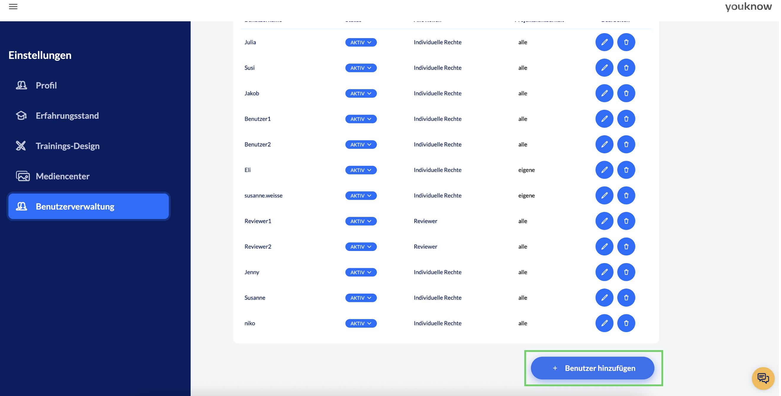 Über das Icon mit dem Mülleimer direkt neben dem Stift können Sie den jeweiligen Benutzer löschen.