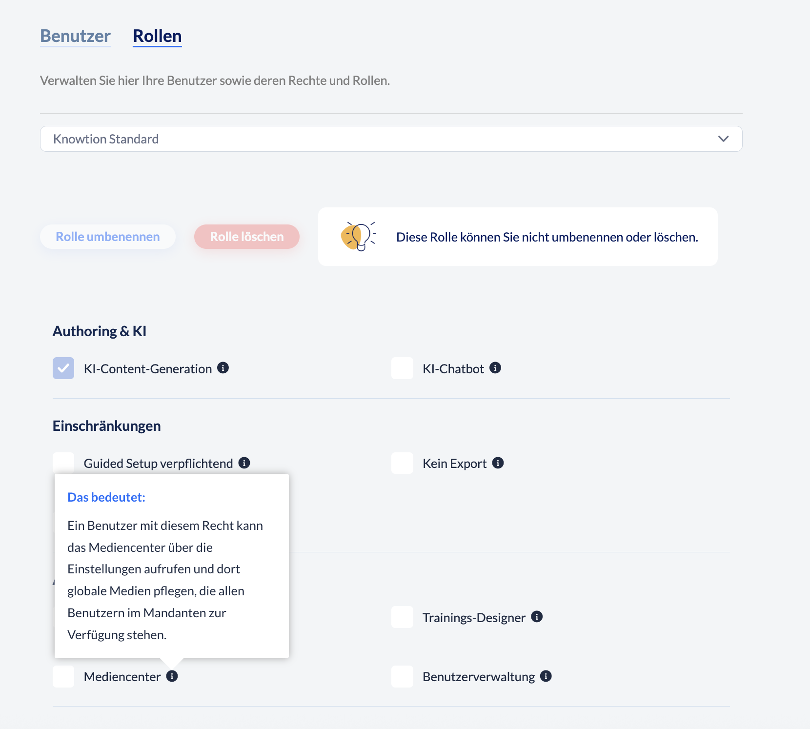 Bei jedem Recht befindet sich ein kleines “i”. Das Hovern über diesen Tooltip zeigt Ihnen, was sich genau hinter dem Recht bzw. hinter der Einschränkung verbirgt:
