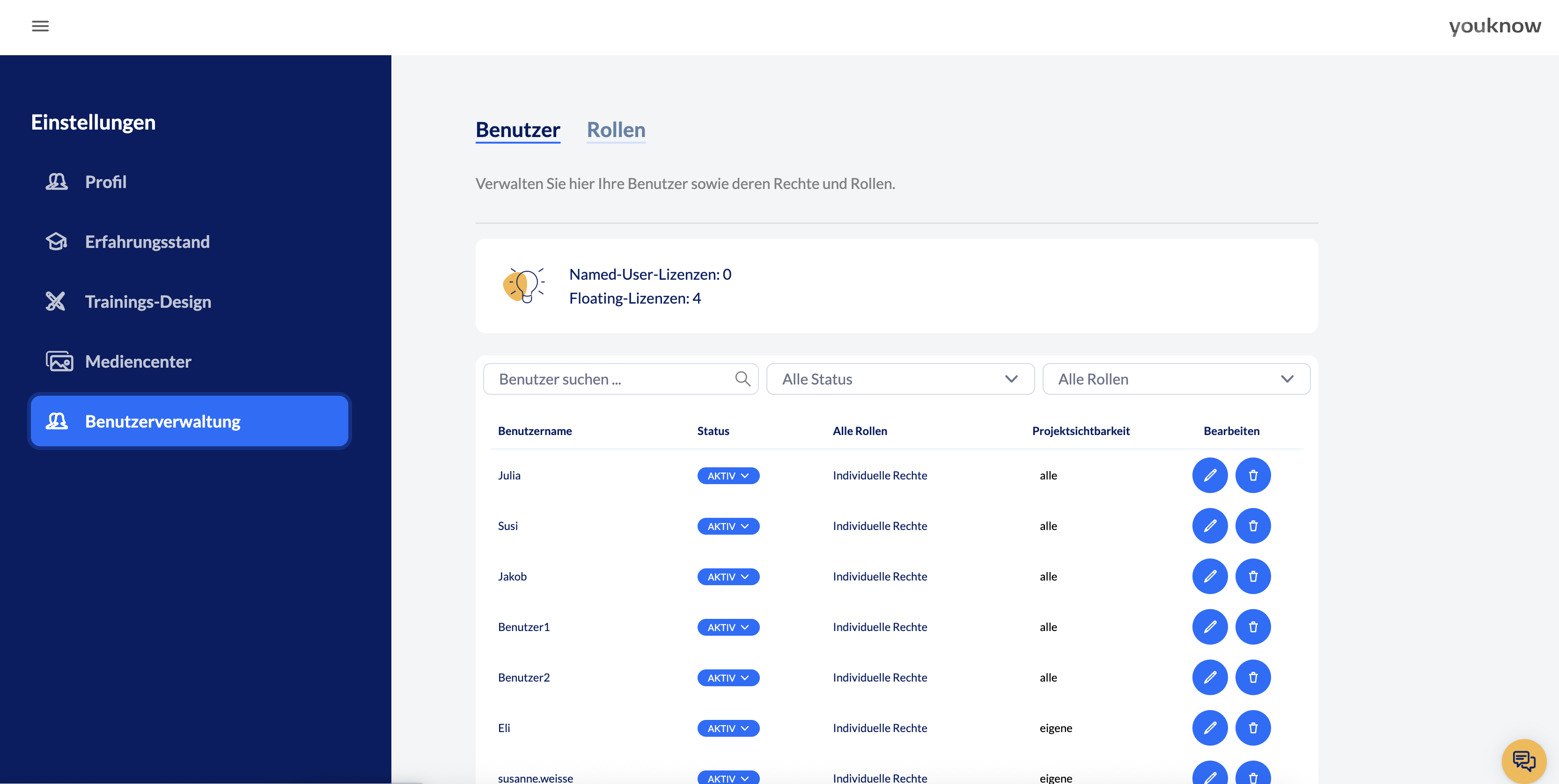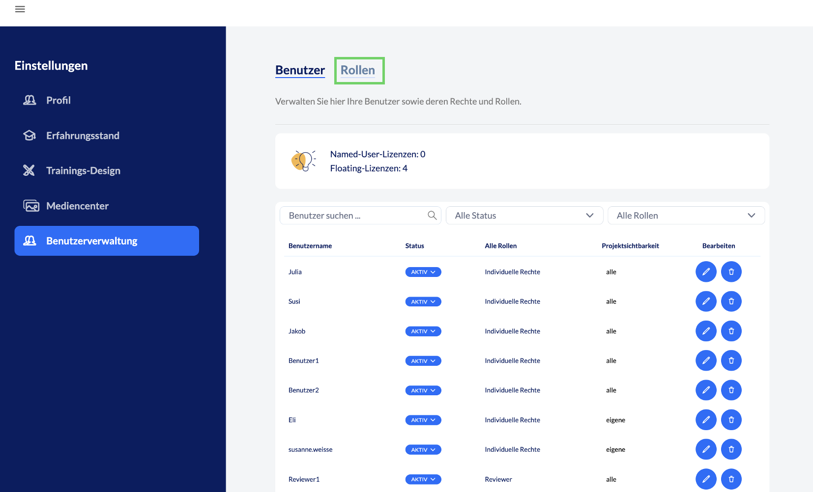 Die Benutzerverwaltung enthält zwei Bereiche – beim ersten Aufrufen landen Sie bei den Benutzern. Sie können oben neben der Überschrift “Benutzer” auf “Rollen” klicken, um zum Bereich der Rollen zu gelangen.