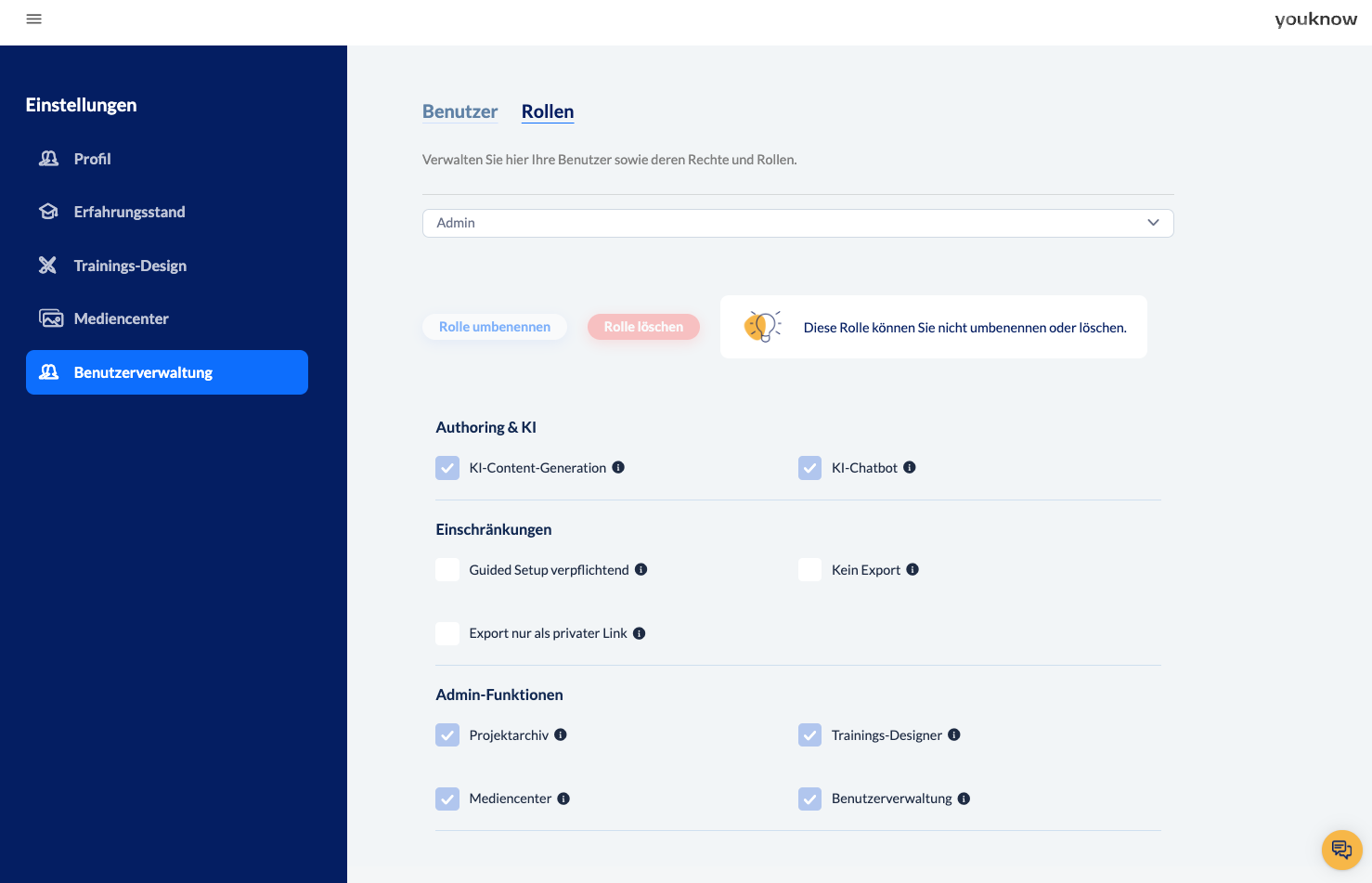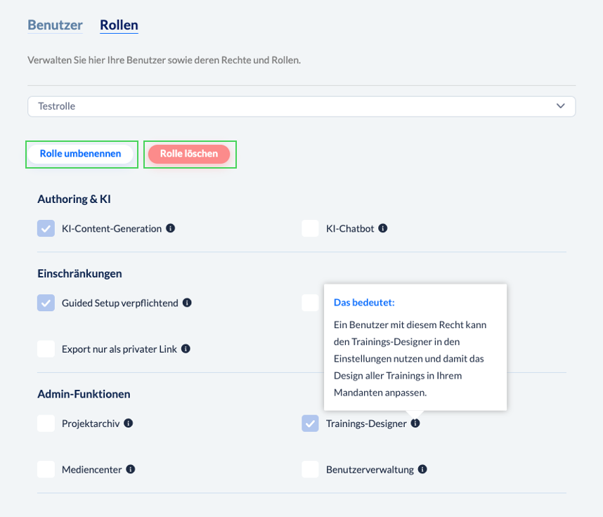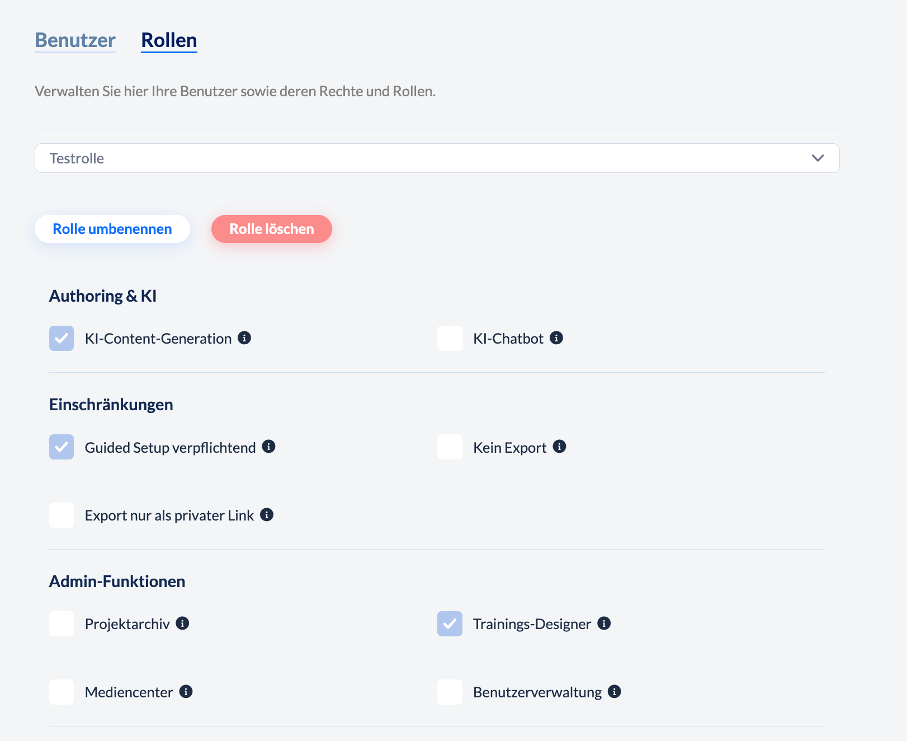 Administrator: Der Admin hat standardmäßig die folgenden Rechte das Recht, KI für die Inhaltserstellung und den KI-Chatbot zu nutzen. Außerdem hat er Zugriff auf das Projektarchiv, die globale Mediathek, den Trainingsdesigner und die Benutzerverwaltung.