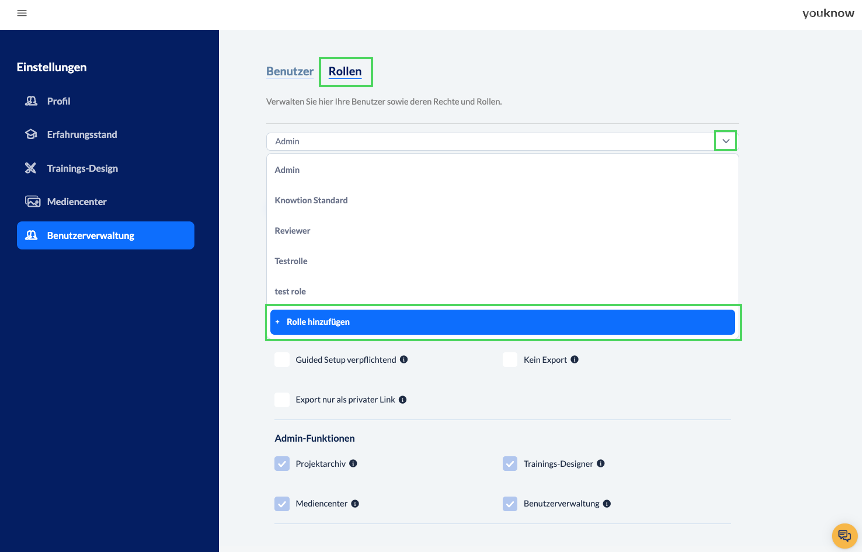 Um eine neue Rolle anzulegen, klicken Sie im Dropdown-Menü unter Benutzerverwaltung -> Rollen auf „Rolle hinzufügen“.