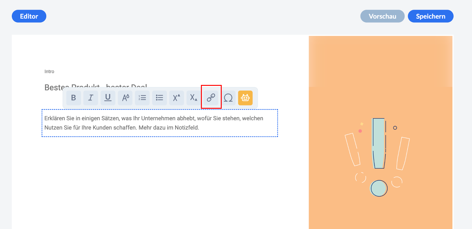 Sie können in Ihrem Projekt ganz einfach einen Link einbauen. Und zwar geht das im Texteditor auf der jeweiligen Seite über das folgende Icon: