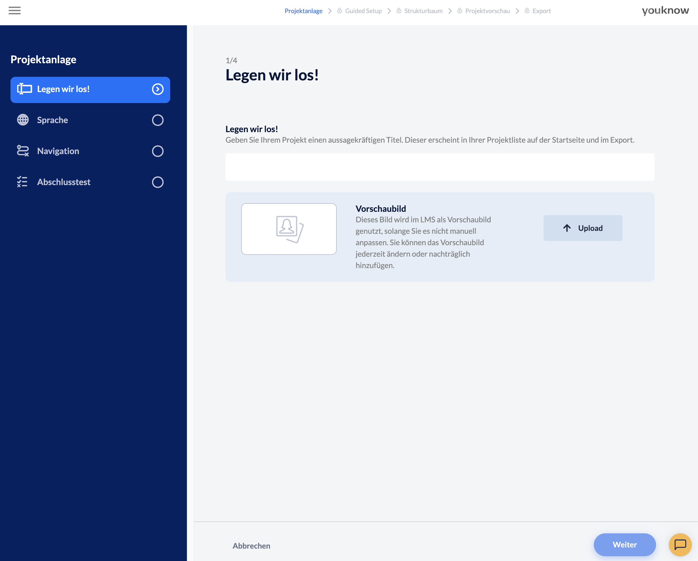 Vergeben Sie einen aussagekräftigen Projekttitel. Bitte beachten Sie dabei, dass dieser sowohl in der Liste Ihrer Projekte als auch im betreffenden Projekt selbst, z. B. im Hauptmenü, erscheint. Sie können den Projekttitel später ändern, indem Sie in der Projektliste (Startseite) auf den Titel eines Projekts klicken und diesen neu vergeben. Zudem haben Sie auf dieser Seite die Möglichkeit, ein Vorschaubild für Ihr Training hochzuladen. Dieses wird in der Projektliste angezeigt und später nach dem Export im LMS, wo Sie es natürlich jederzeit ändern können.