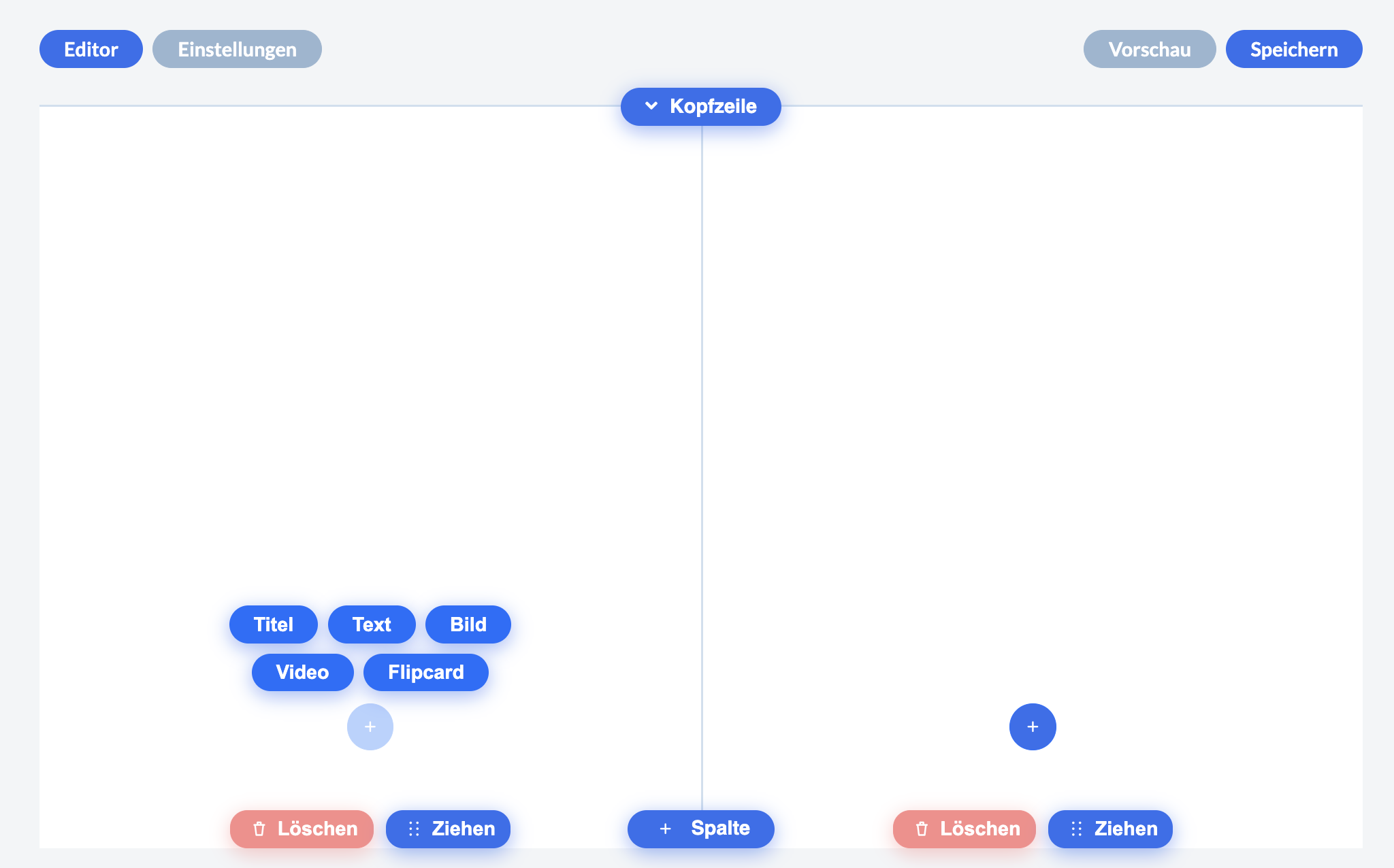 Pro Spalte können Sie bis zu 5 Elemente einfügen: Titel, Text, Bild, Video, Flipcard