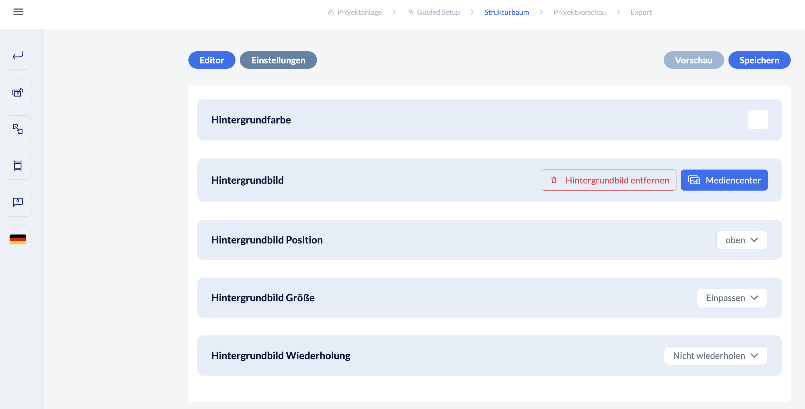 Wählen Sie nun bei “Hintergrundbild” das gewünschte Bild aus dem Mediencenter aus – oder laden dort direkt eins hoch.