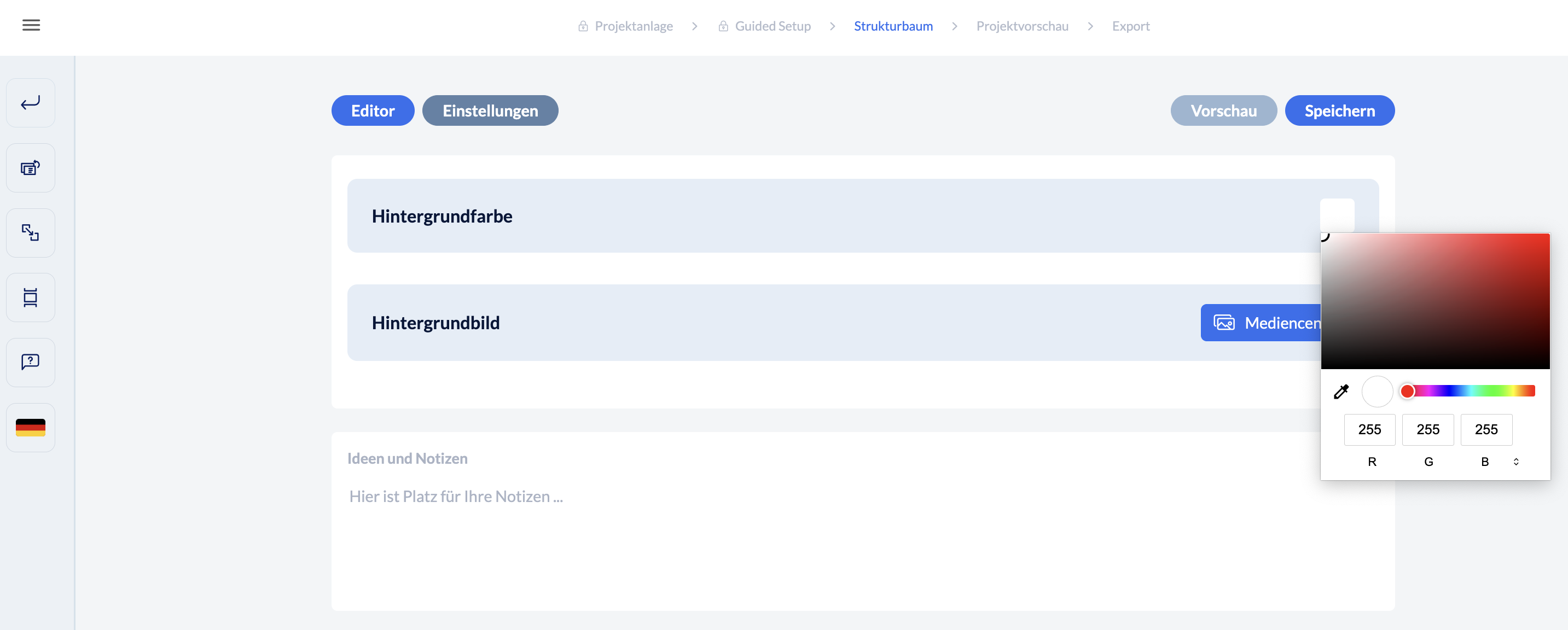 Wählen Sie nun hier die gewünschte Farbe aus. Sie können für die Eingabe wählen zwischen RGB, HSL oder HEX