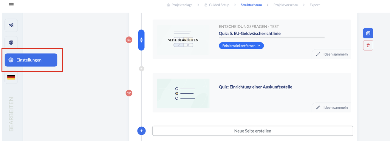 Weitere Einstellungsmöglichkeiten zum Abschlusstest, zum Beispiel mit wie viel Prozent der Test als bestanden gilt oder ob er wiederholt werden darf, definieren Sie in den Projekteinstellungen. Diese finden Sie im Strukturbaum in der Seitenleiste links unter dem Rädchen-Icon.