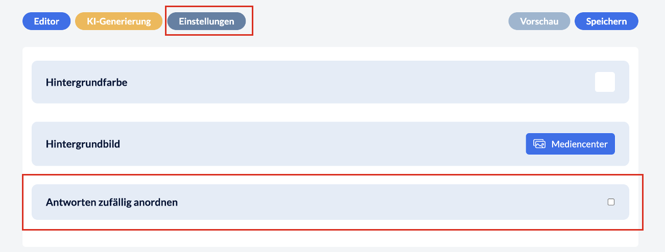 Öffnen Sie dazu einfach die gewünschte Seite im Abschlusstest und klicken dann im Seiteneditor auf den Button “Einstellungen”. Anschließend finden Sie die Option “Antworten zufällig anordnen” – diese bitte anhaken.