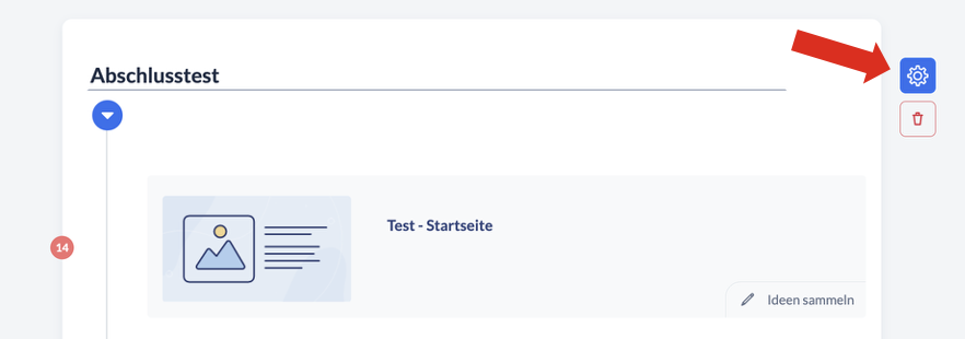 Sie finden alle Einstellungsmöglichkeiten zum Abschlusstest im Strukturbaum: Beim Hovern mit der Maus über den Abschlusstest-Block erscheint neben dem Papierkorb-Icon zum Löschen des Tests auch ein Zahnrad-Icon. Hier finden Sie die Einstellungsmöglichkeiten, wie beispielsweise dass der Abschlusstest erst angeklickt werden kann, nachdem alle Inhaltsseiten der Kapitel besucht wurden.