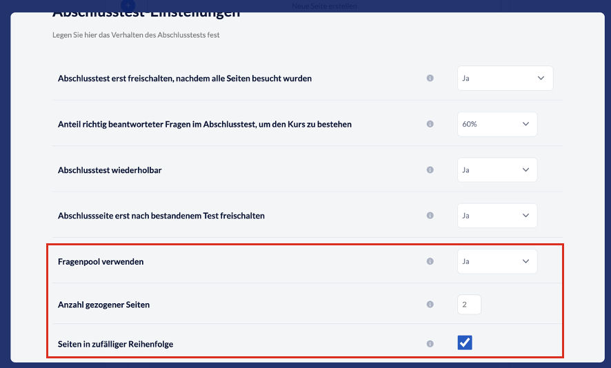 Bei den Einstellungen können Sie auch festlegen, dass die angelegten Fragen im Abschlusstest als Fragenpool betrachtet werden sollen. Sie entscheiden, wie viele der Fragen später insgesamt ausgewählt werden sollen und in welcher Reihenfolge (entweder entsprechend der angelegten Reihenfolge oder zufällig).