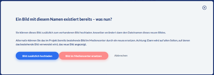 Sie sehen alle Medien, die den Bildtitel enthalten und können auswählen, ob Sie die unter dem Titel bereits enthaltene Datei in Ihrem Projekt übernehmen möchten, oder ob Sie die Datei ersetzen möchten.