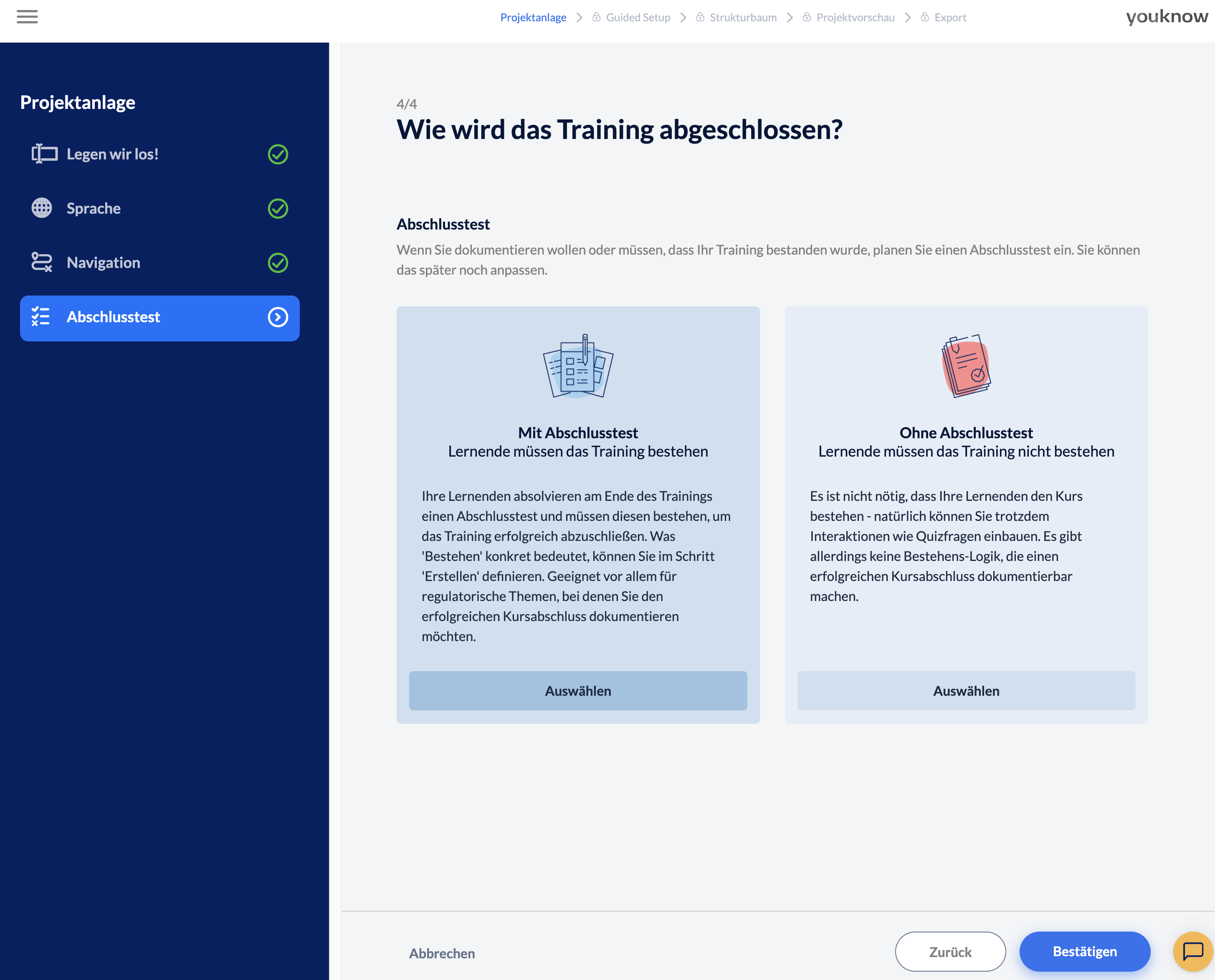 Gut zu wissen: Wenn Sie Ihr Projekt später von der KI erstellen lassen wollen, empfehlen wir hier immer die Auswahl “Mit Abschlusstest”. Löschen können Sie später immernoch. Aber es ist nicht möglich im Nachhinein einen Abschlusstest per KI generieren zu lassen.