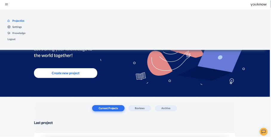 After logging in to knowtion, you will be taken to the start page. Here you can use the burger menu at the top left to call up the knowtion “knowledge store” and different “settings” (like design, your personal password etc.), for example. The start page also gives you an overview of all the projects you have created.