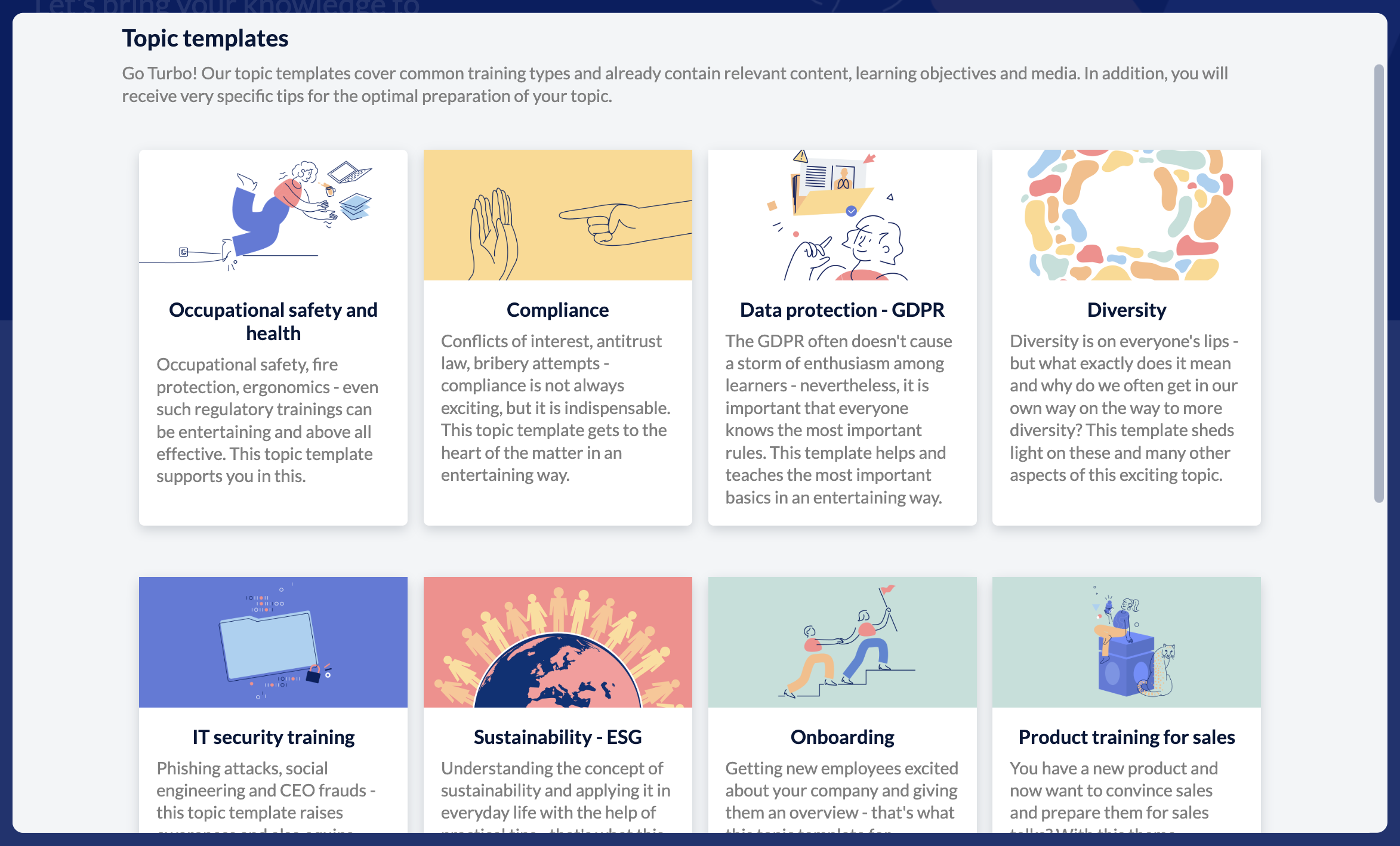 In knowtion, ready-made training courses are already waiting for you - on various topics. These are our so-called “Topic templates”. They include videos, illustrations and texts as well as topic-specific tips. You can simply adopt the training courses directly or add your own customised content. A very quick way to your finished training course - simply select a suitable topic template and customise it as required.
