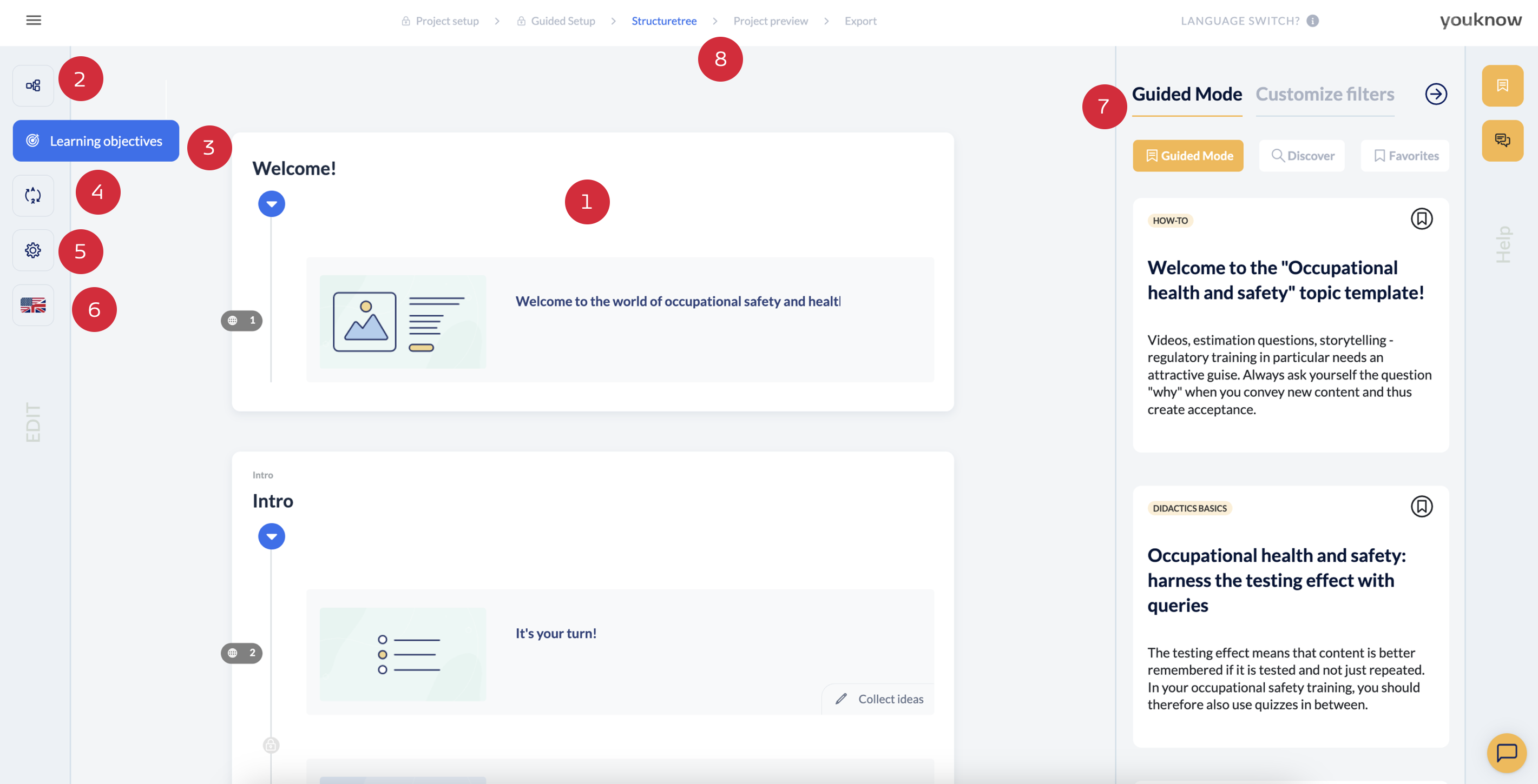 The right-hand side of the screen offers you support when working on your project: there you will find the Guided Mode (7), which supports you with customised tips. At the top of the screen in the process bar (8), you can access the project preview and the export area.