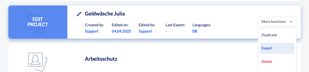 Good to know: Instead of going via the structure tree, you can alternatively go straight to the export page in the project list via ‘More functions’ and ‘Export’.