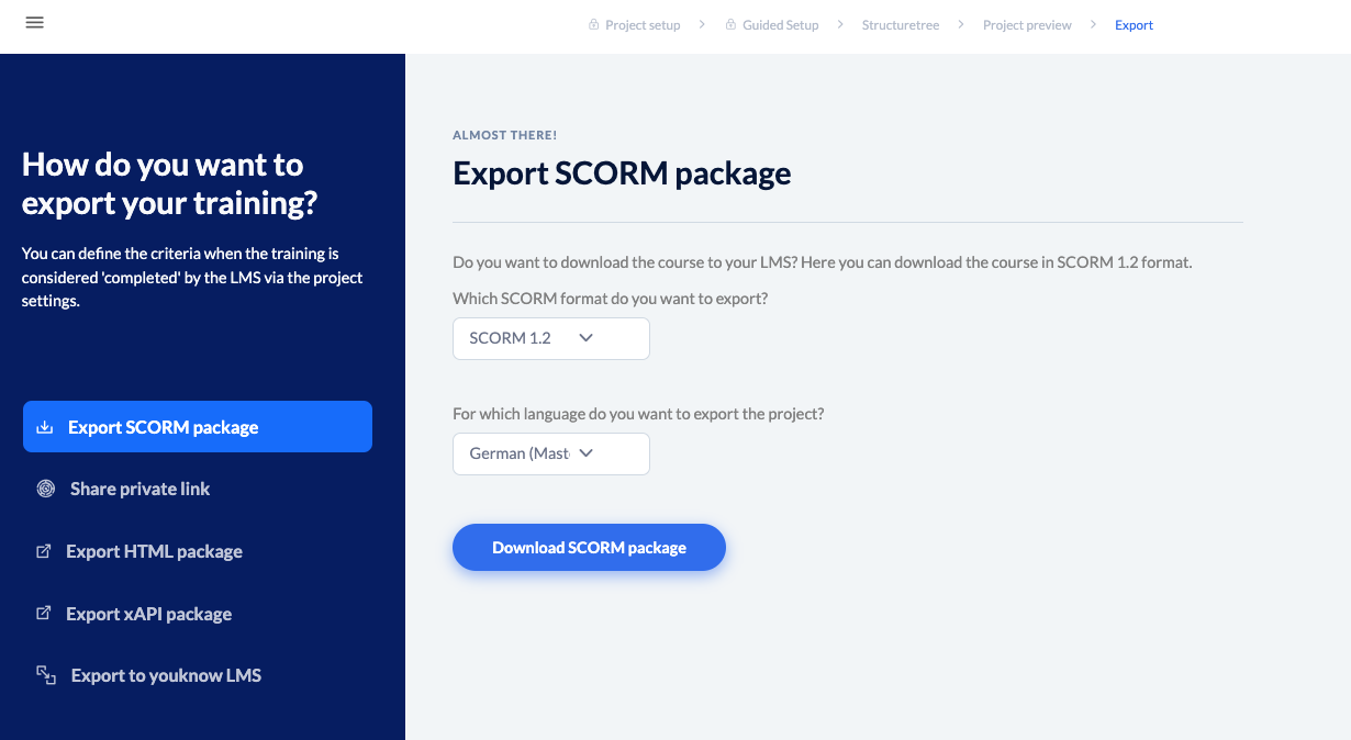 The important thing is: Your project is always exported in the language selected in the drop down list. So simply select the language first and then click on “Download SCORM package”.