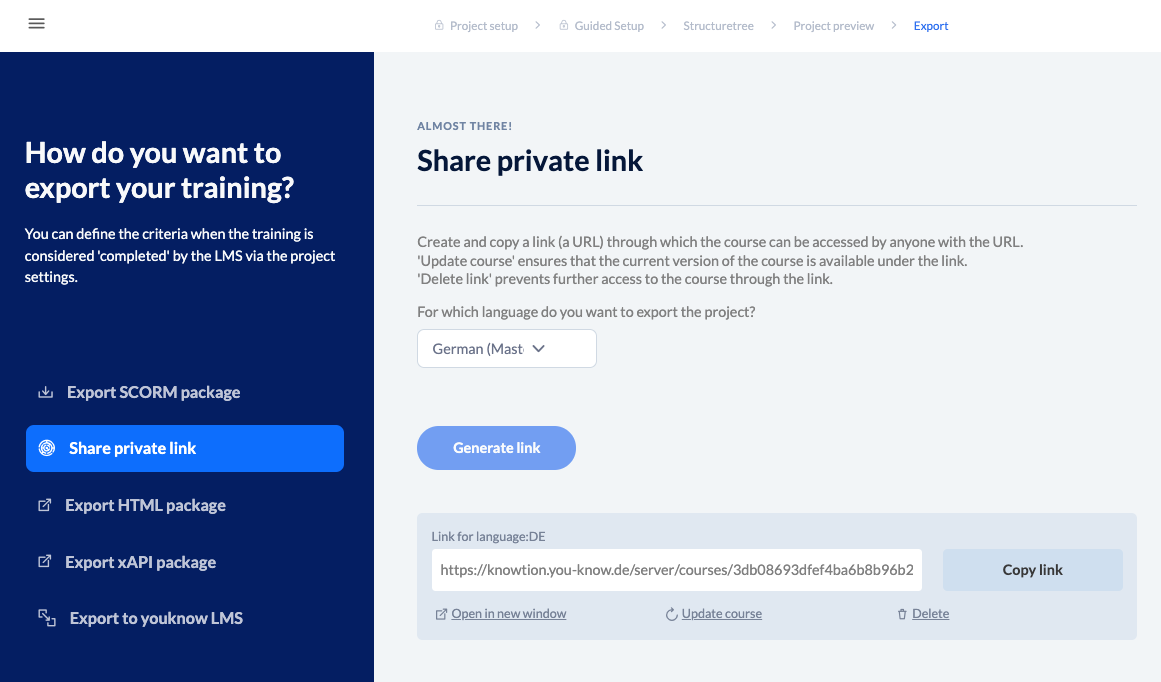 Would you like to make your project available to your colleagues for review purposes? The private link is ideal for this. In this case, your project will remain on the knowtion server. Simply click on “Generate link” and share it with whoever you like.