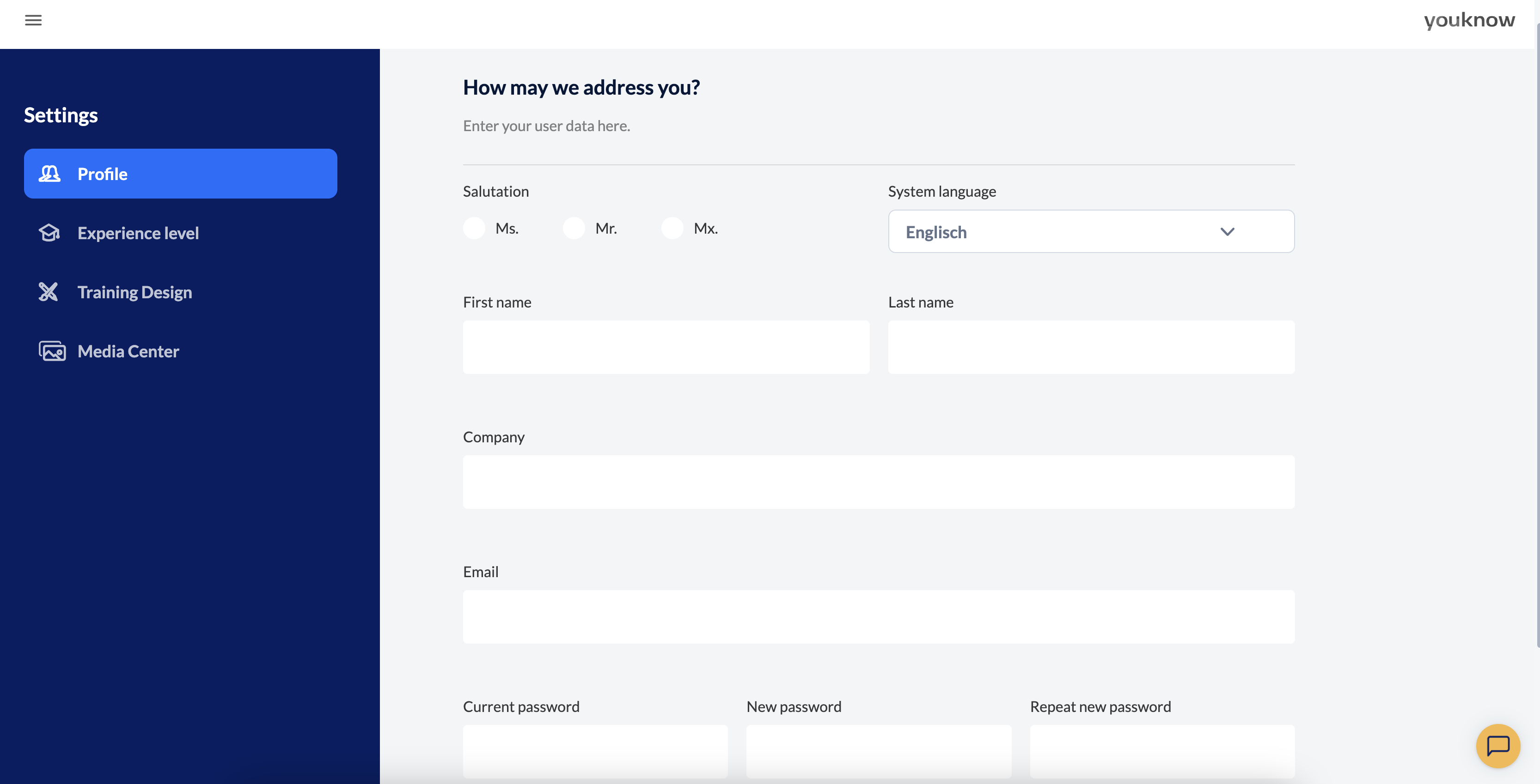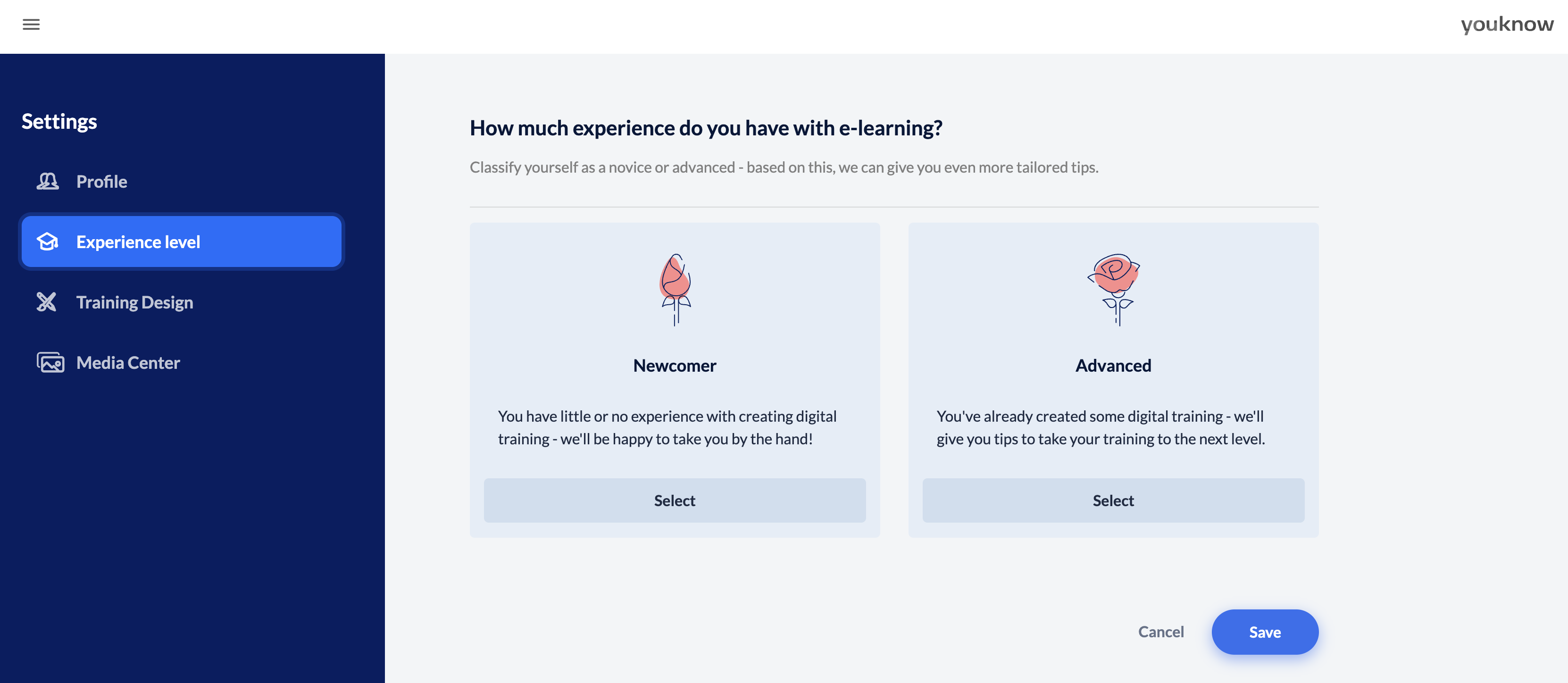 We recommend that you also enter your level of experience here. In this way, knowtion can provide you with customised tips for your level of knowledge when creating your training course.