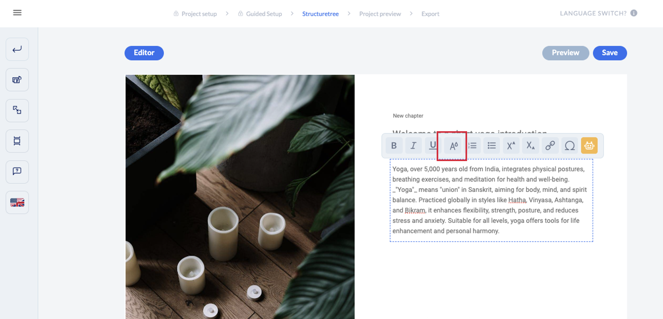knowtion offers various formatting options for text in the page editor. This also includes setting a colour. You can simply enter the desired HEX value here.