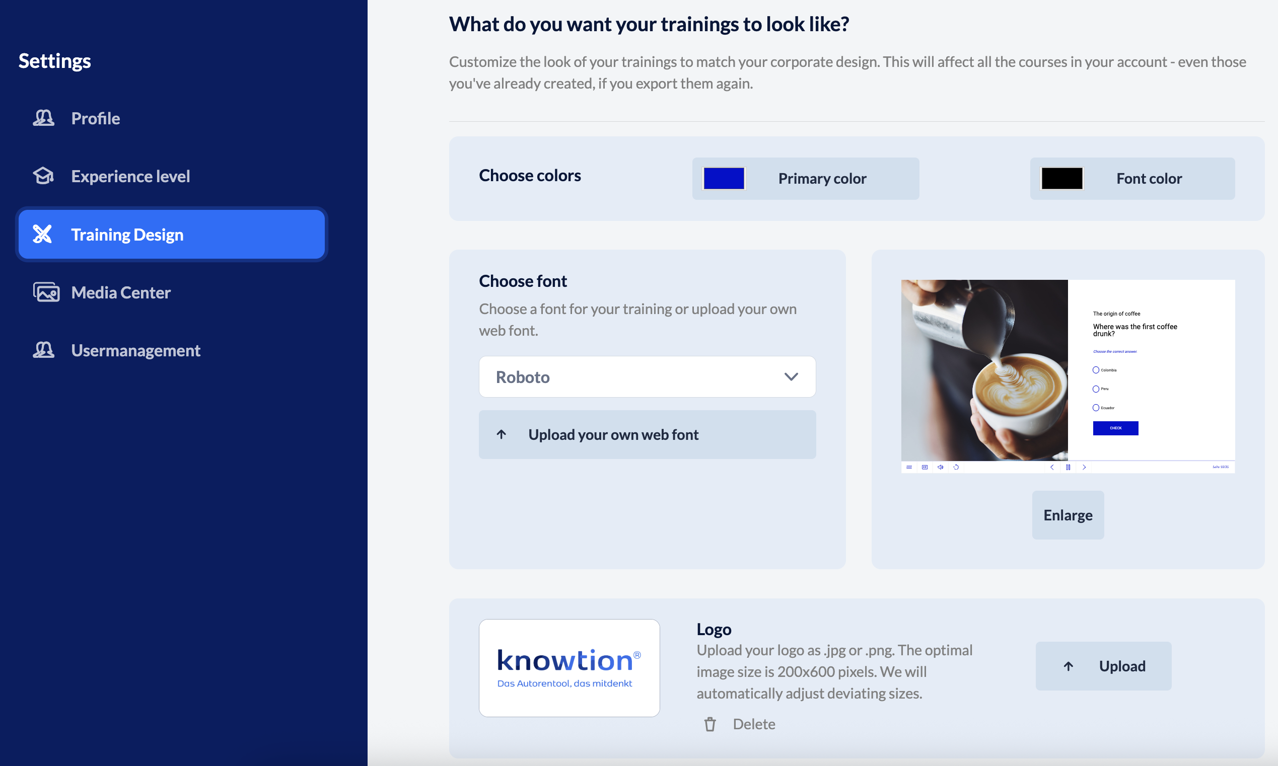 knowtion offers you multiple page types in the structure tree that you can use for your training courses. Extensive UX/UI expertise has been incorporated in their design so you can concentrate fully on developing your content. The design options you have, you’ll find here in the Training Design area where you can customise the basic project layout according to your corporate design with just a few clicks. Select the primary colour of your company, choose a suitable font (or upload your own – if it’s a web font) and upload your logo.