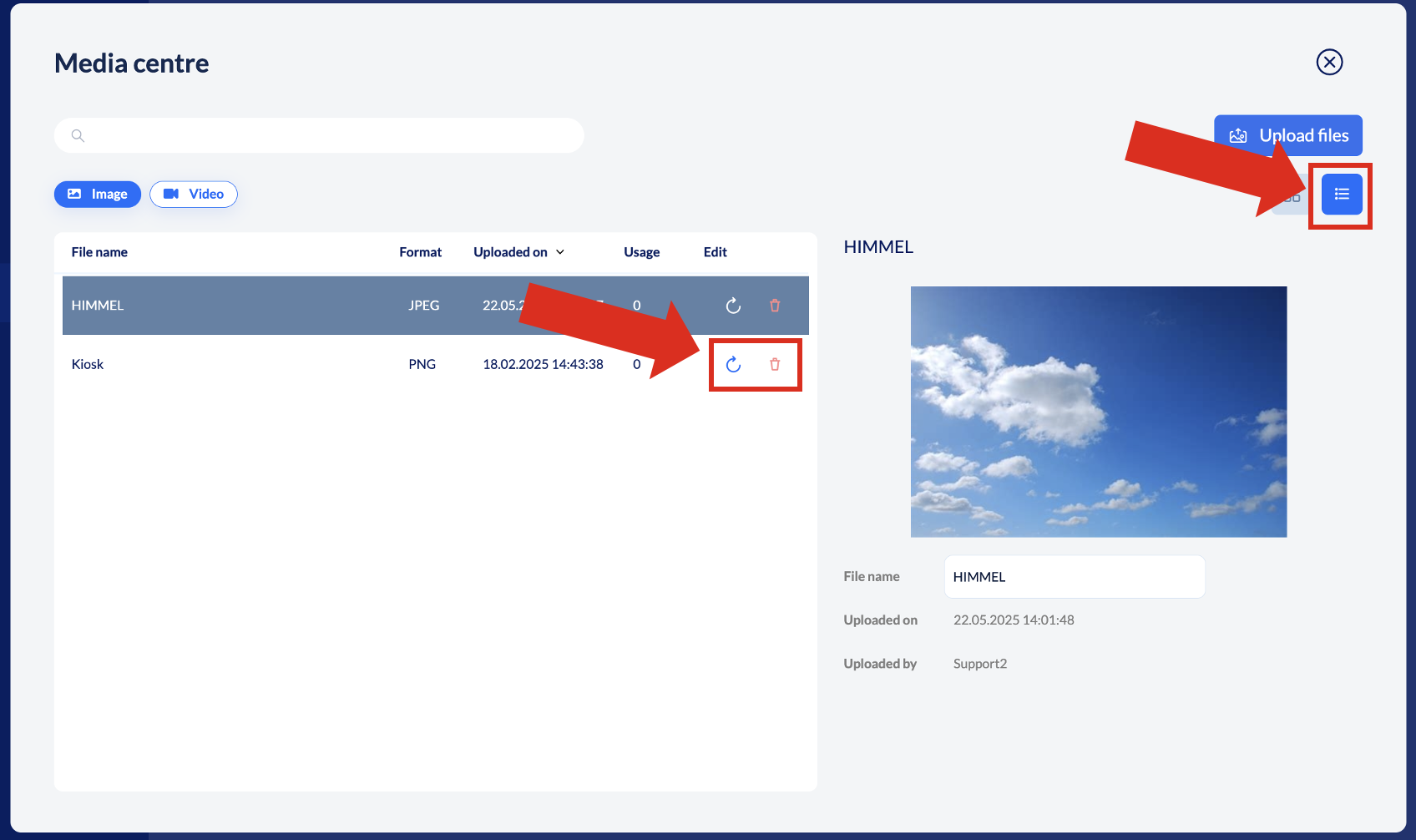 To delete delete or replace a file, switch to list view via the list-icon on the top right: