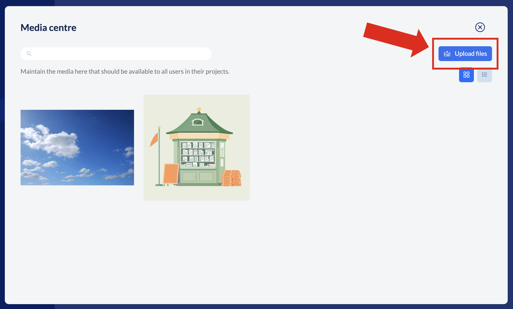 In the popup that opens after clicking on “Media Center” you can upload any images or videos. The media uploaded here is available in every project created in knowtion – the ones that already exist as well as new ones yet to be created. If you need the media only for ONE project, please upload it directly via the media center IN the project.