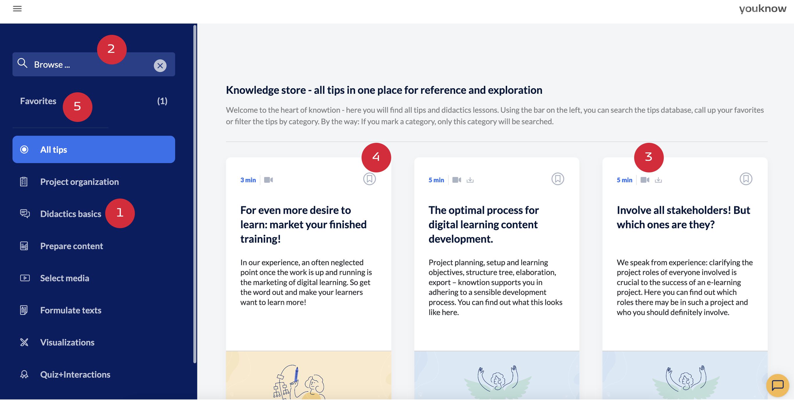 In the ‘Knowledge’ section of the burger menu, you will find all tips and didactic sessions in one place - for reference and exploration. All of knowtion's didactic know-how is sorted here according to various categories (1), such as Project organisation, Didactic basics, Preparing content and much more.