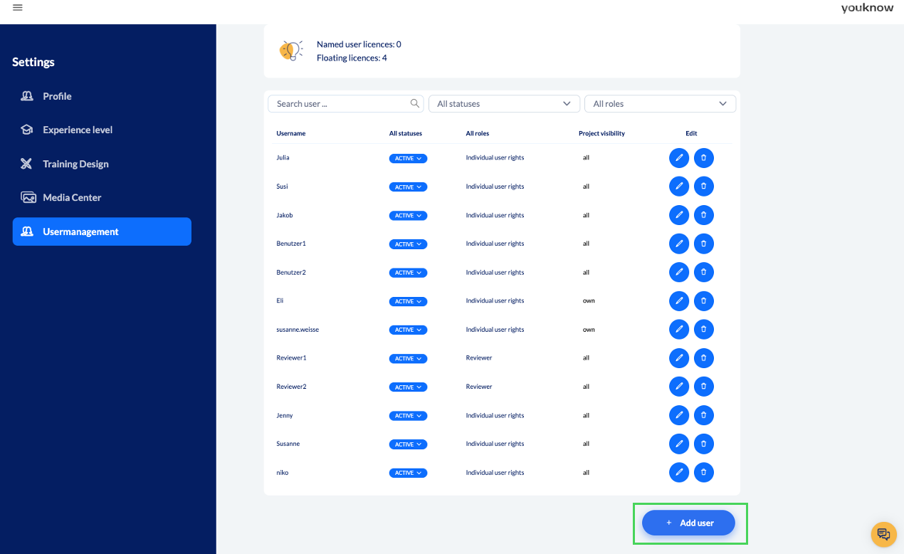 All roles: In this dropdown you will find all standard roles of youknow as well as the roles that you have created yourself (see the extra article on roles - linked at the end of this article). Certain rights are already stored for the Admin, Reviewer and Knowtion Standard roles. If you select the ‘Individual rights’ role, you can compile the user's rights yourself.