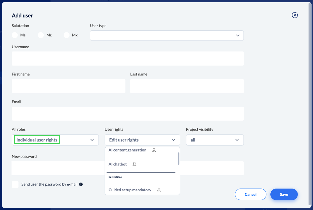 User rights: This drop-down menu can only be edited if you have selected ‘Individual rights’ for the role. You can then customise the desired rights for the role here.