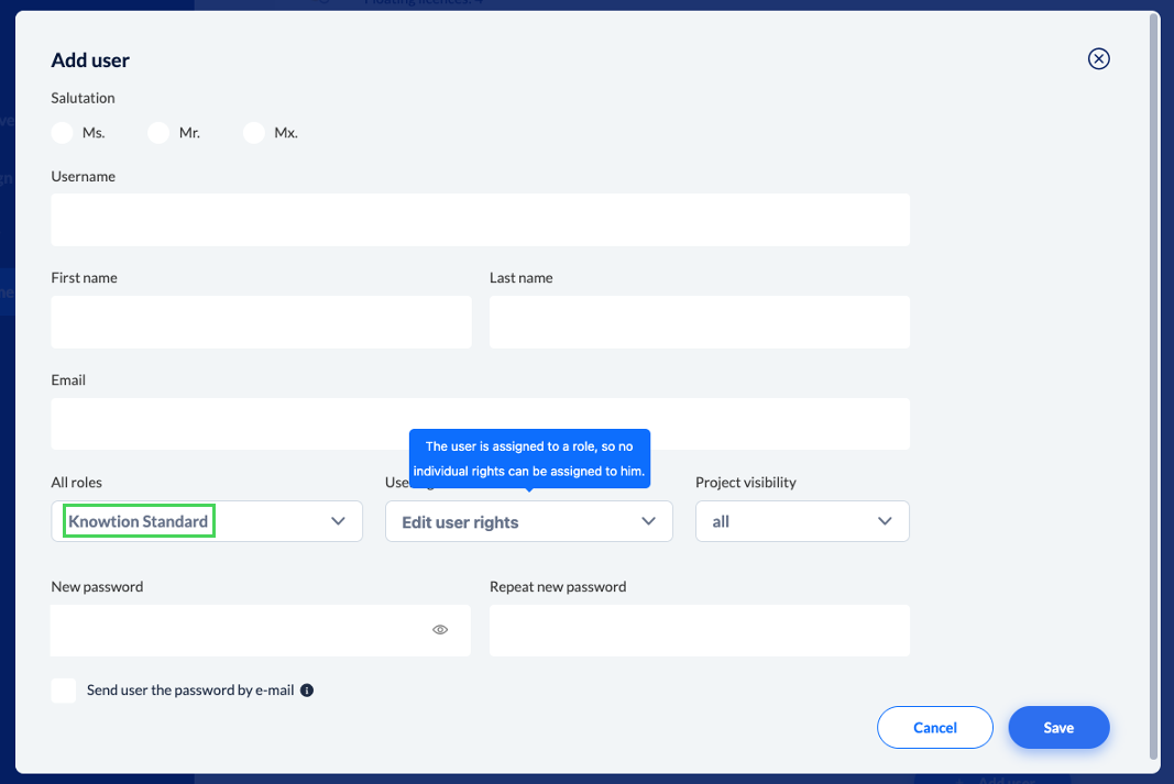 Here you can see that selecting the ‘Knowtion Standard’ role means that you cannot assign any individual rights. This role has already defined certain rights: