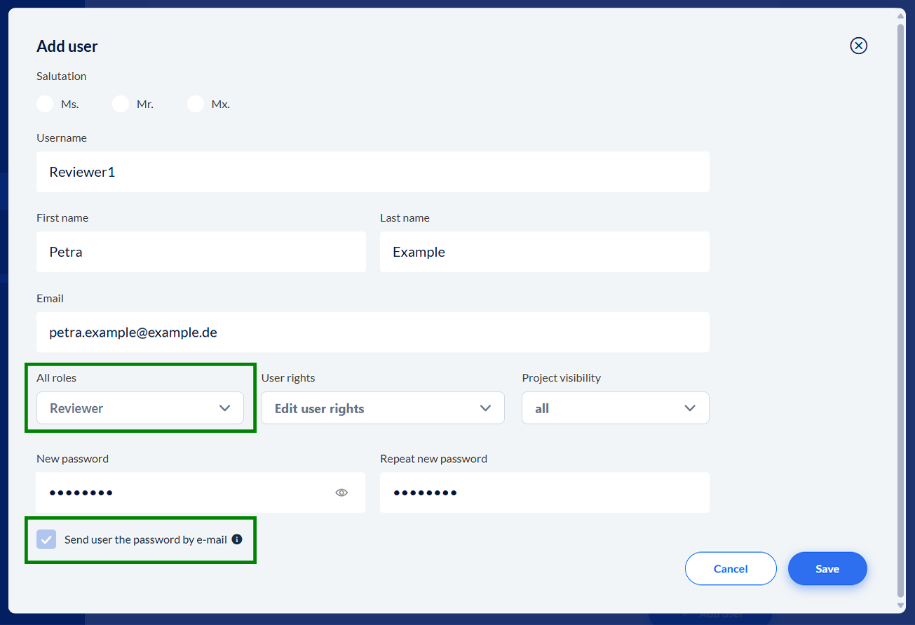 To let the user see the project, you have to add them to the project first. A step-by-step guide for this, and for using the review mode as a project creator (“author”), can be found here: