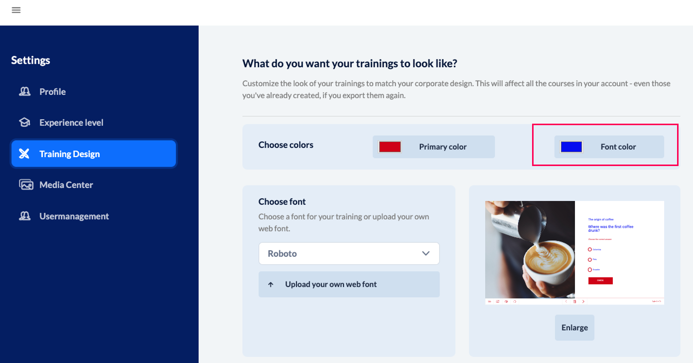 IMPORTANT: If text has already been recolored within the text editor (e.g., a word in the text is red), it will NOT be recolored when you adjust the font color in the training design in general.