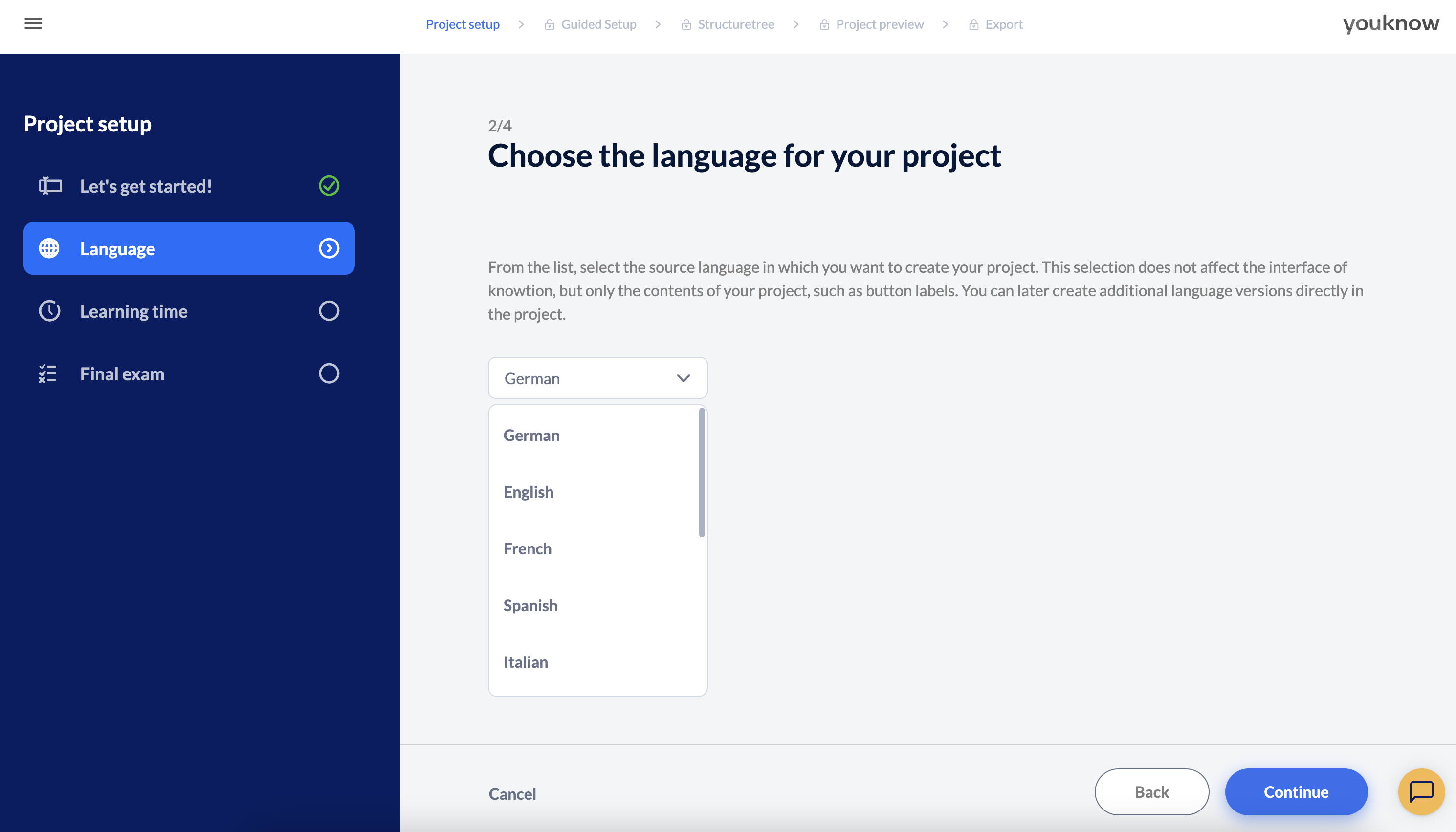 Select the language in which you want to create the master of your project from the drop-down list. This selection does not affect the user interface of knowtion, but only the content of your project, such as button labelling and dummy texts. You can create additional language versions directly in the project at a later stage.