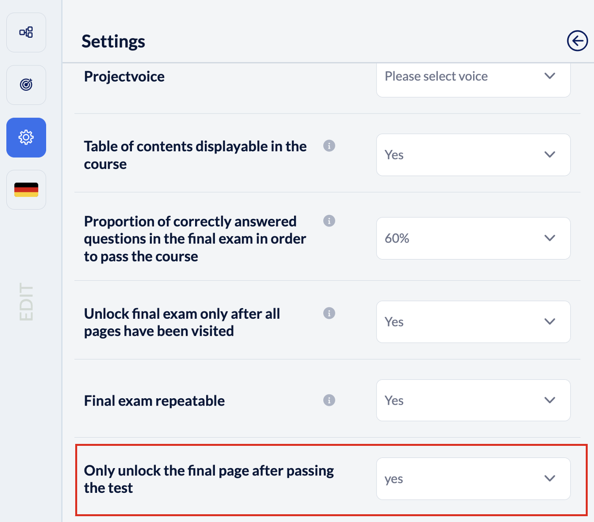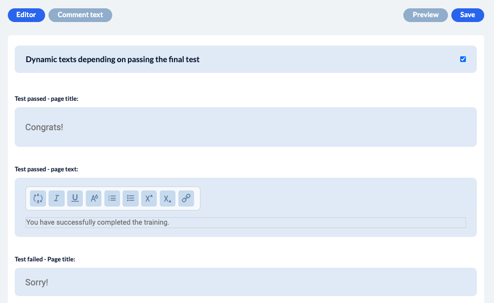 Then tick the box ‘Dynamic texts depending on passing the final test’